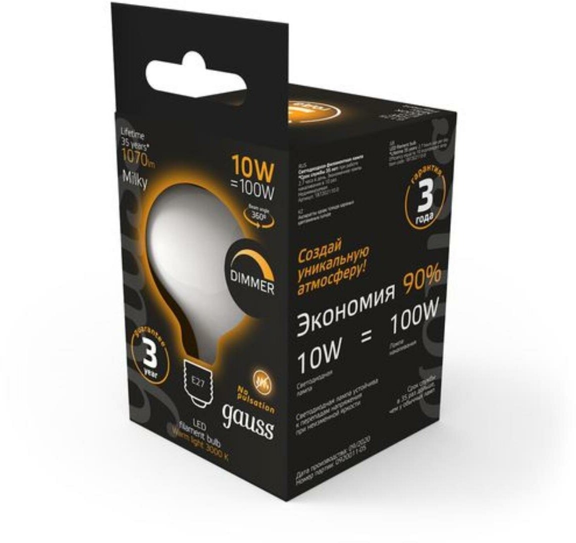 Модель: Лампа Filament LED диммируемая milky Е27 G125 10W 1070lm 3000К