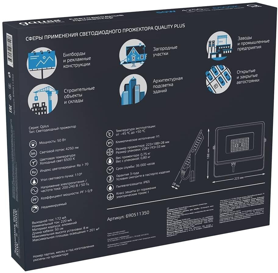 Светильник Gauss Прожектор LED Qplus 50W 4250lm 6500K 200-240V IP65 LED
