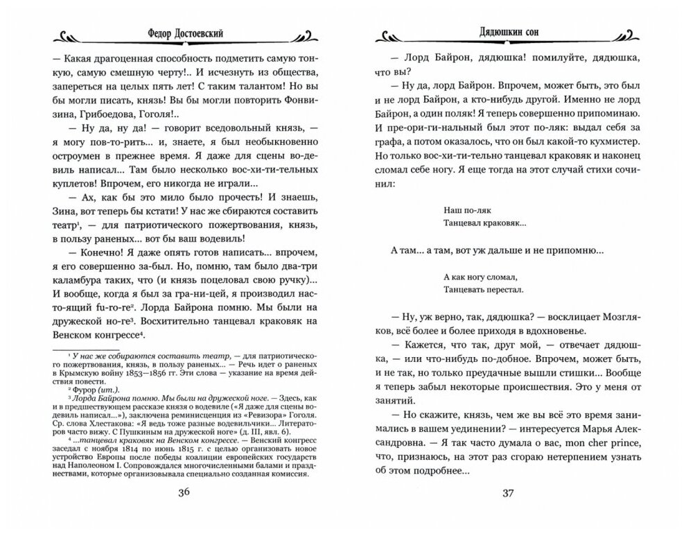 В книге два произведения. "Дядюшкин сон" великолепное произведение, выше всех похвал. Концовка просто сногшибательная. "Вечный муж" хорошее произведение. Уступает первому. Интрига до самого конца произведения. Имеется притензия к самой книги, золотые буквы при не очень аккуратном обращении стираются. Приходится всегда об этом помнить и обращаться с книгой как с младенцем. Оба произведения обязательны к прочтению, равнодушными не останетесь после прочтения.