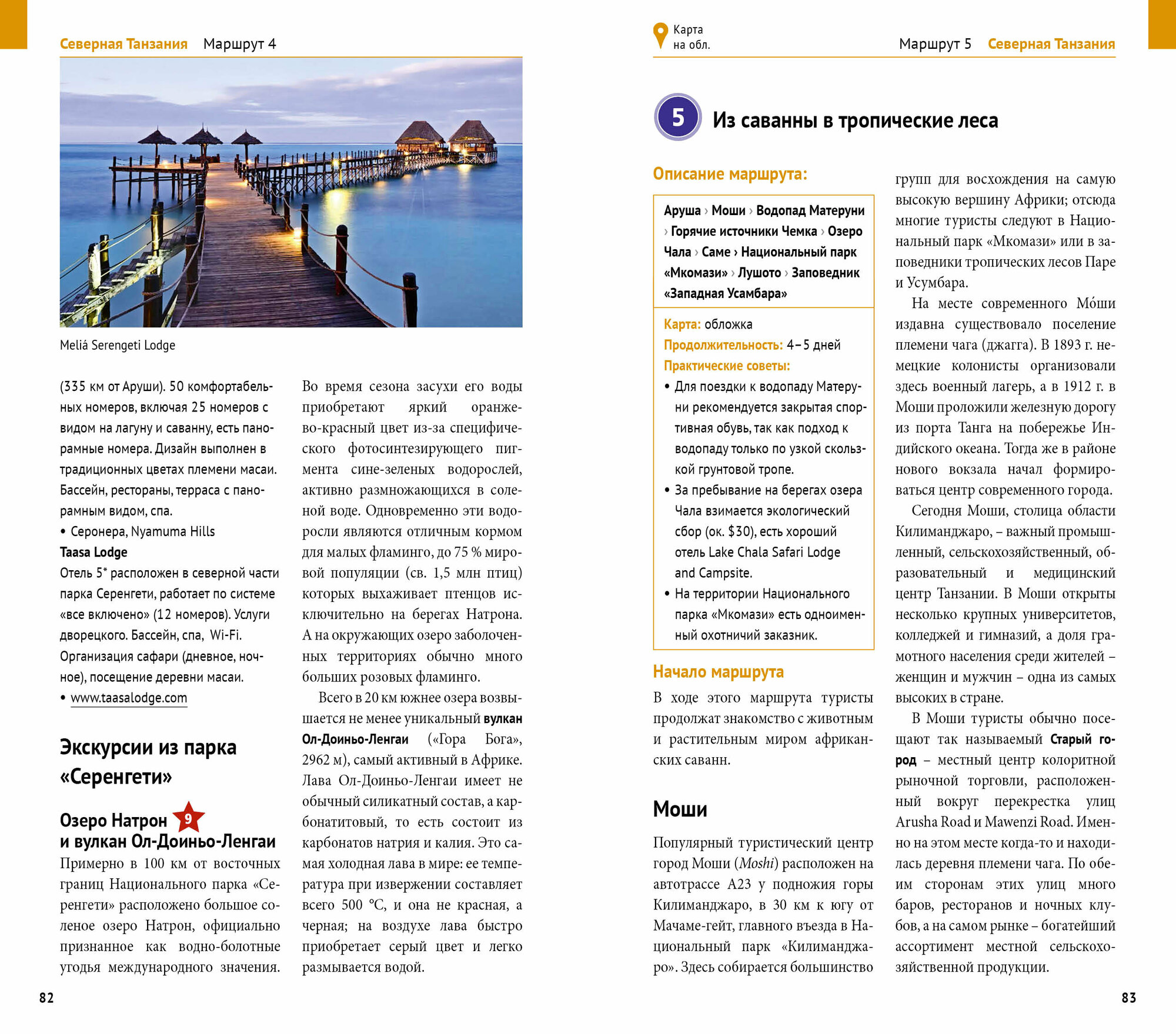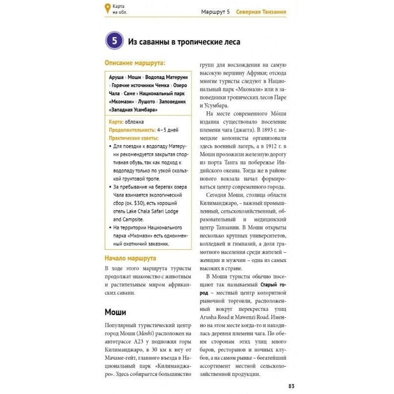 ПОЛИГЛОТ по этой невероятно прекрасной экзотической стране поможет разобраться, что посмотреть в Танзании и какие достопримечательности никак нельзя обойти вниманием. И выбрать, поверьте, есть из чего: 13 маршрутов на любой вкус. Для удобства каждый нанесён на карту-схему. На большой карте, вложенной под задний клапан, вы найдёте карту всей страны, а также карты-схемы самых популярных маршрутов по ЗАНЗИБАРУ!