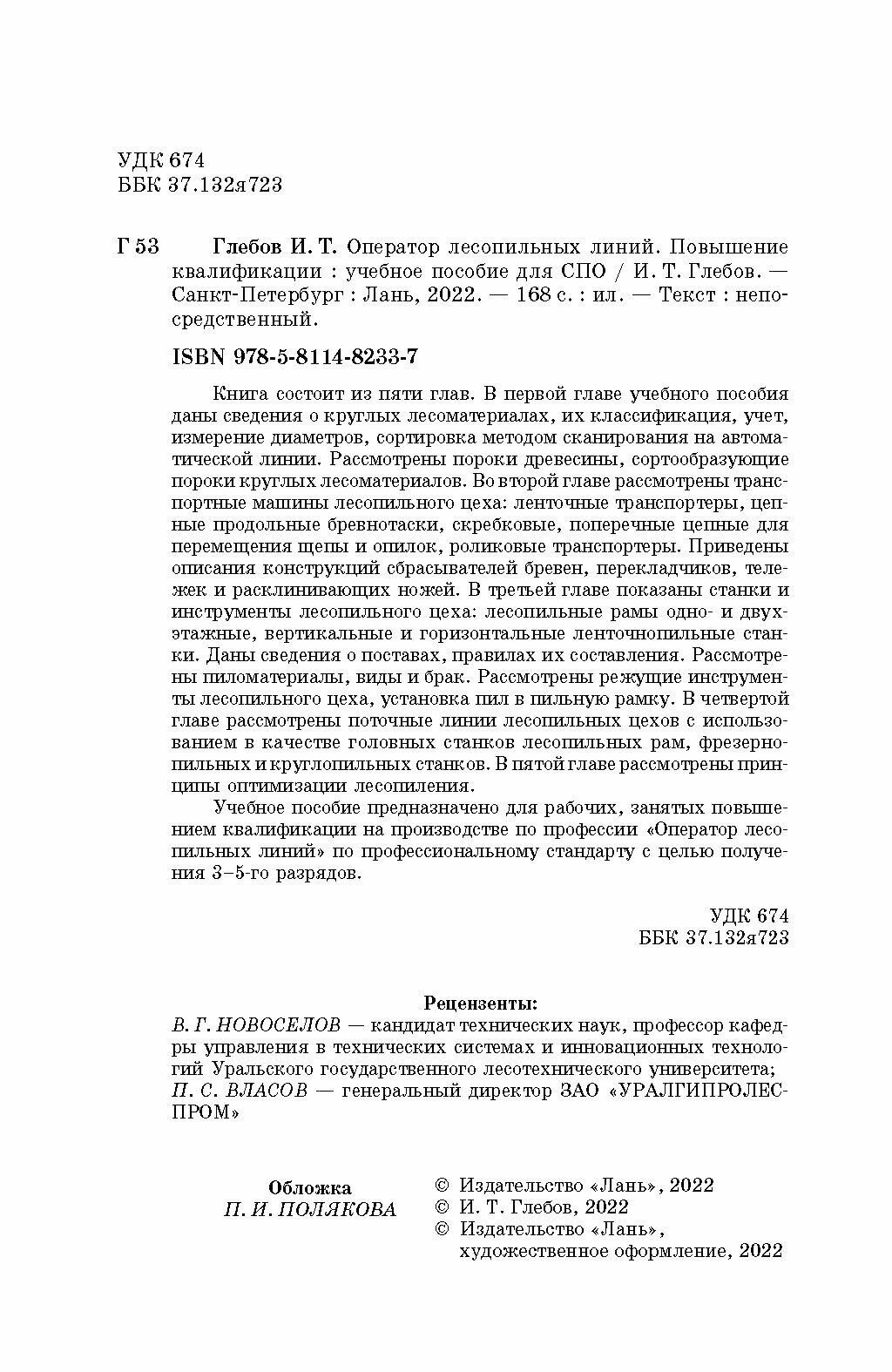 Оператор лин.по пр.шпона и фанеры.Повыш.квалиф.СПО (И. Т. Глебов); Издательство ЛАНЬ, 2022