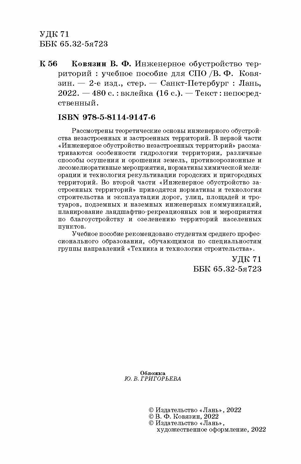 Инженерное обустройство территорий.СПО2изд (Ковязин Василий Федорович); Лань, 2022