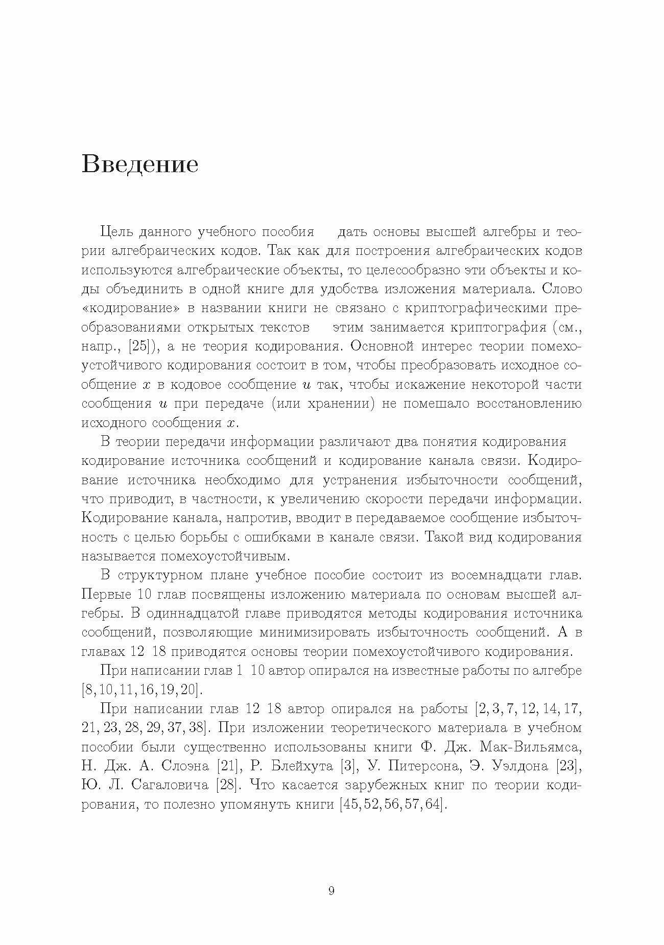 Учебное пособие содержит алгебраическую основу и ее применение в теории кодирования. Сначала приводятся основные сведения по таким алгебраическим структурам, как группы, кольца, кольца многочленов, кольца матриц, системы линейных алгебраических уравнений, векторные пространства, пространства линейных операторов, билинейные и квадратичные формы, поля, конечные поля. Далее излагаются базовые разделы алгебраической теории кодирования: линейные коды, циклические коды, коды Боуза-Чоудхури-Хоквингема, коды Рида-Соломона, обобщенные коды Рида-Соломона, альтернативные коды, коды Гоппы, кодовые криптосистемы Мак-Элиса и Нидеррайтера. Особое внимание уделено алгоритмам декодирования, которые математически обосновываются и сопровождаются численными примерами. Также рассматриваются оптимальные алфавитные коды.
