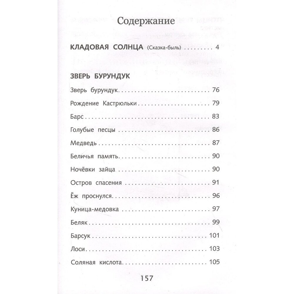 В сборник вошли сказка-быль "Кладовая солнца" и рассказы о природе, объединенные в три раздела: "Зверь бурундук", "Птицы под снегом", "Разговор деревьев".