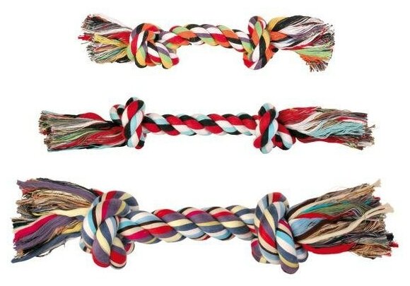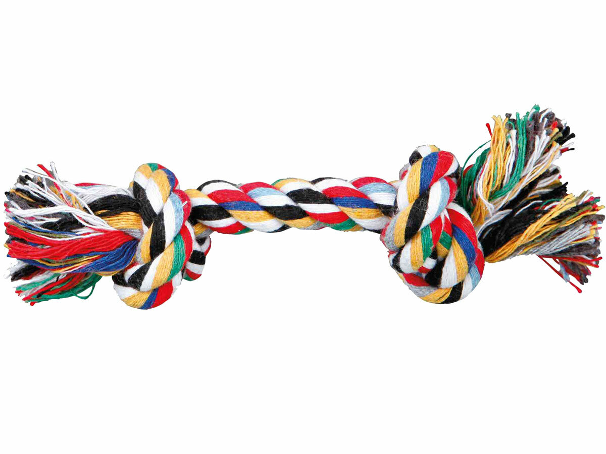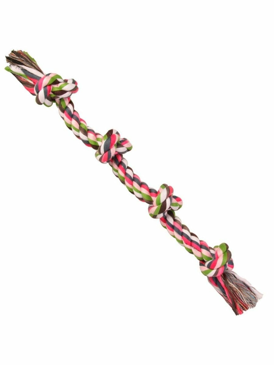 Забавная игрушка для активной маленькой собачки. Игрушка яркая и безопасная для здоровья. Выполнена она в виде крепкой веревки длиной 54 см с узлами на концах. Использовать эту игрушку можно на прогулке или дома. Игры в перетягивание очень любят практически все собаки, также как и трепать игрушки. В процессе такой игры хорошо укрепляются и быстро тренируются челюсти собаки.Игрушка для собак этой модели используется не только для развлечений, но и для проведения важных гигиенических процедур, как то чистка зубов и десен от налета и остатков пищи, которые всегда вызывают неприятные запахи из пасти. Не каждая собака спокойно перенесет эту процедуру традиционным способом с зубной щеткой, поэтому гораздо проще использовать специальные игрушки. Шершавая поверхность веревки хорошо чистит зубы и десны от налета и частичек застрявшей пищи, что является одной из основных причин появления неприятного запаха.Игрушка для собаки выполнена из веревки, сделанной из нитей натурального хлопка, которые очень плотно переплетены между собой. Именно поэтому ей не страшны крепкие острые зубы собаки. Она не сможет порвать или разгрызть ее. Использованные краски полностью безопасны для здоровья питомца.