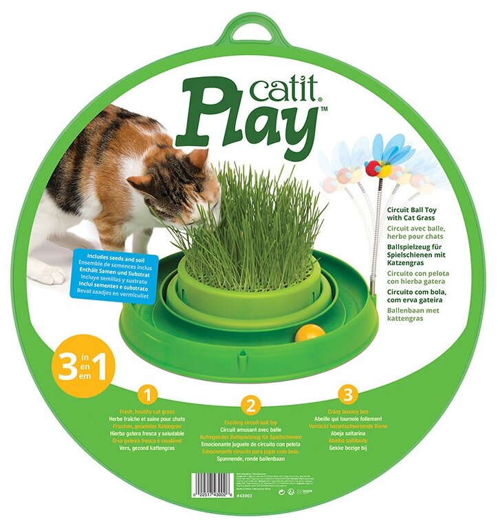 В новой вариации популярной игрушки совмещены игровой трек с шариком и сад для выращивания свежей молодой травки. Шарик легко катается по желобу, загнутые сверху края препятствуют его выпадению. Мягкая игрушка на пружинке устанавливается в любое из четырех отверстий по краям игрушки.Рекомендации по выращиванию травки для кошки:Большинству кошек нравятся молодые всходы пшеницы, овса или ячменя. В возрасте двух недель листья грубеют и уже не так нравятся кошкам, поэтому своевременно подсевайте новые семена.Перед посадкой травки промойте все детали чистой водой. В емкость поместите примерно 0,7 л грунта и маленькую горсть семян. Перемешайте семена с грунтом. Равномерно увлажните смесь водой. На 0,7 л вермикулита потребуется 125 мл воды, если вы используете другой грунт, то количество воды может быть другим. Поверх защитной сетки прикрепите пищевую пленку и поставьте сад с травкой в теплое светлое место для прорастания. Через 3-4 дня, когда появятся первые ростки, уберите пленку и обрызгайте всходы водой из пульверизатора. Еще через 3-4 дня зеленые листочки должны дружно пробиться через сетку, тогда уже можно дать кошке полакомиться свежей травкой.По мере перерастания травы и огрубения листьев подсевайте небольшое количество семян прямо через защитную сетку или замените полностью грунт на новый и прорастите семена заново с использованием укрытия из пленки.В комплект входит 3 пакета грунта по 0,5л каждый и семена пшеницы 70 г.Размер: 36 x 8 см, высота игрушки на пружинке 25 см.Цвет: зеленый.Вес: 900 г.