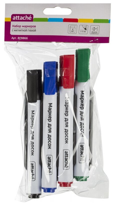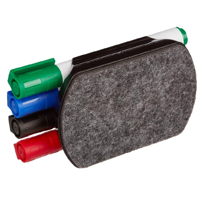 Набор включает в себя: магнитную губку-держатель, 4 маркера для белых досок черного, синего, красного и зеленого цветов.