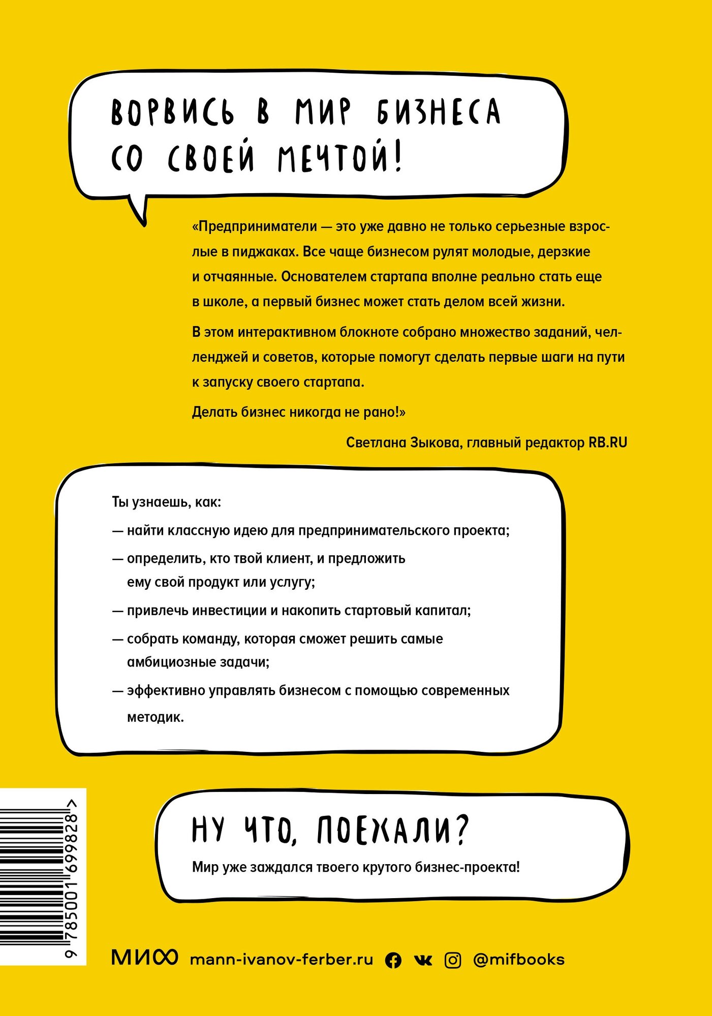 Читатель пройдет путь от поиска идеи до создания бизнес-плана и сделает первые шаги к воплощению мечты - запуску собственного стартапа. Конкретные рекомендации (как провести SWOT-анализ, определить рыночную цену продукта, подготовить презентацию для инвесторов) представлены в виде заданий и челленджей. Поэтому подростков ждет не только теория, но и возможность опробовать знания на практике. А результатом работы станет бизнес-идея, которую можно воплотить в жизнь.