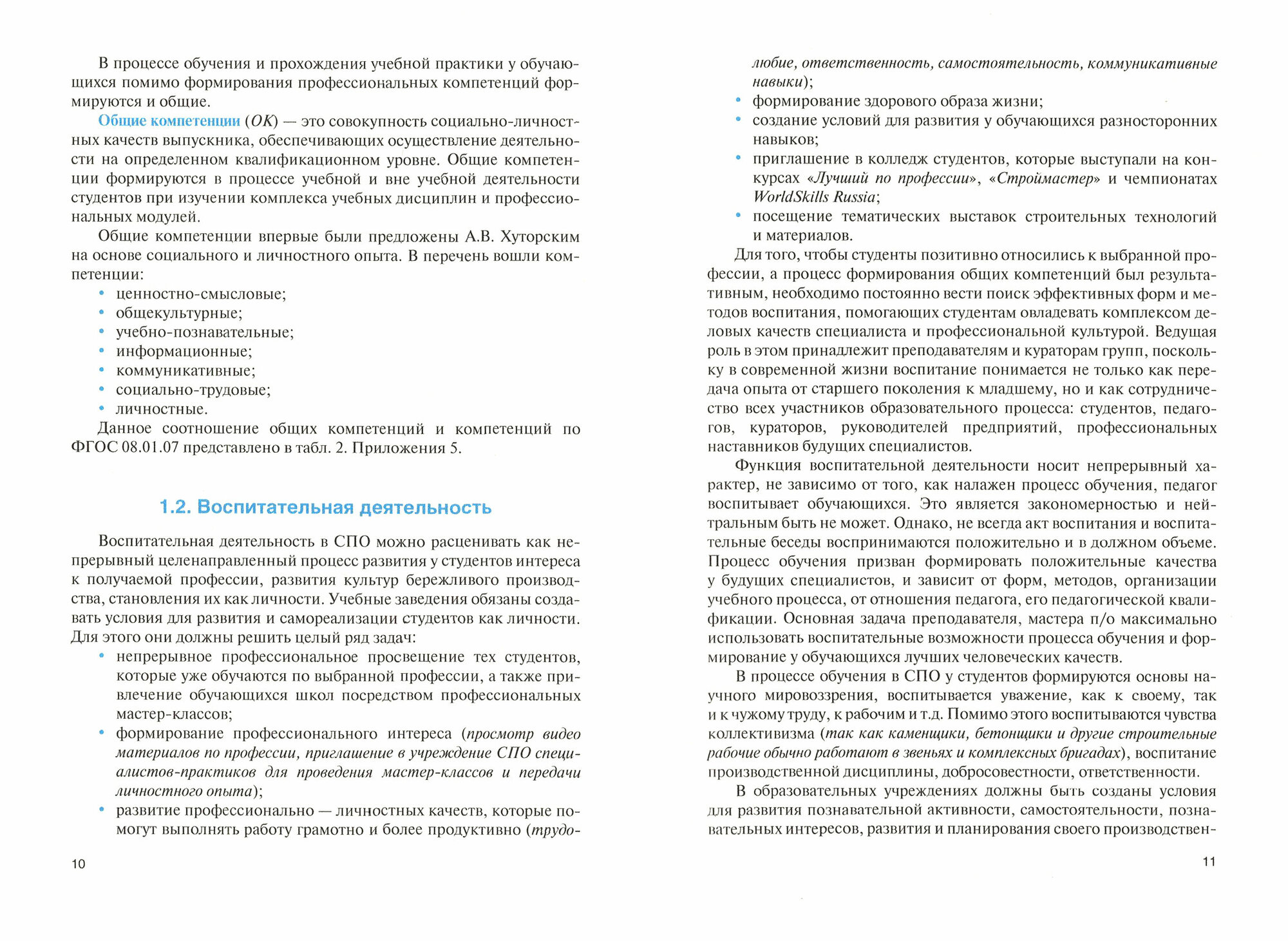 Рассмотрены общие сведения о процессе обучения в учреждениях среднего профессионального образования, воспитательной деятельности, роли мастера п о в образовательном процессе. Разработаны более тридцати технологических карт, которые будут полезны не только преподавателям спецдисциплин, но и обучающимся во время учебной практики. Проведен подробный разбор различных заданий по стандартам WorldSkills для итоговой государственной аттестации. Соответствует ФГОС СПО последнего поколения. Для студентов среднего профессионального образования, обучающихся по специальности 08.01.07 «Мастер общестроительных работ» и 08.02.01 «Строительство и эксплуатация зданий и сооружений».