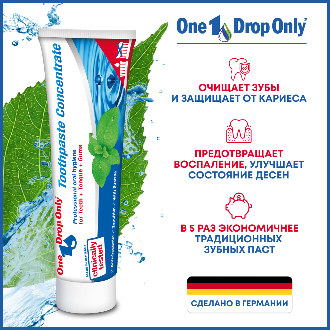 Компания One Drop Only является лидером по производству концентрированных средств гигиены полости рта, производимых на основе натуральных природных компонентов.Концентрированная зубная паста One Drop Only содержит эфирное масло чайного дерева и бисаболол, обладающие выраженным антибактериальным действием, предотвращают воспаления и улучшают состояние десен.Не содержит лаурилсульфат натрия (SLS), тем самым не раздражает слизистую полости рта.Содержит фтор в допустимой концентрации (1450 ppm), укрепляет зубную эмаль, защищает от кариеса, увеличивает резистентность к действию кислот.За счет низкого уровня RDA (30) идеально подходит для использования с электрическими зубными щетками и для людей с повышенной чувствительностью зубов (гиперестезией эмали). Активная мягкая пена обеспечивает комплексный уход за зубами, деснами и языком.Эфирное масло мяты перечной успокаивает слизистую полости рта, освежает и дезодорирует, эффективно препятствует появлению галитоза (неприятного запаха изо рта).Паста-концентрат в 5 раз экономичнее традиционных зубных паст.Сделано в Германии.