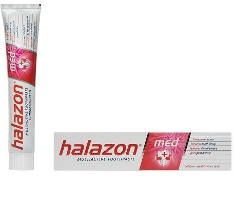 Зубная паста Halazon Multiactive Med эффективно снижает кровоточивость десен, предотвращает скопление зубного налета, укрепляет и защищает зубную эмаль, увеличивает резистентность к действию кислот, вызывающих кариес, освежает и дезодорирует полость рта. - Хлоргидрат алюминия – оказывает вяжущий эффект, снижает кровоточивость десен;- Аллантоин - обладает успокаивающим и заживляющим действием, ускоряет регенерацию клеток слизистой полости рта;- Хоргекседин – оказывает антибактериальное действие, дополнительное очищение и уход за полостью рта;- Фторид натрия (1360 ppm) – за счет включения фтора в решетку зубной эмали, эффективно реминерализует, борется с кариесом; - Эфирные масла ментола и эвкалипта – оказывают длительное освежающее действие; - сделано в Германии Применение: Небольшое количество зубной пасты нанести на зубную щетку. Чистить зубы круговыми движениями, одновременно аккуратно массируя десны. Полость рта ополоснуть небольшим количеством воды, задерживая ее на 20-30секунд. Не глотать. Для достижения максимального эффекта используйте совместно с ополаскивателем Halazon Fresh и зубной щеткой Halazon Inter-Dental.