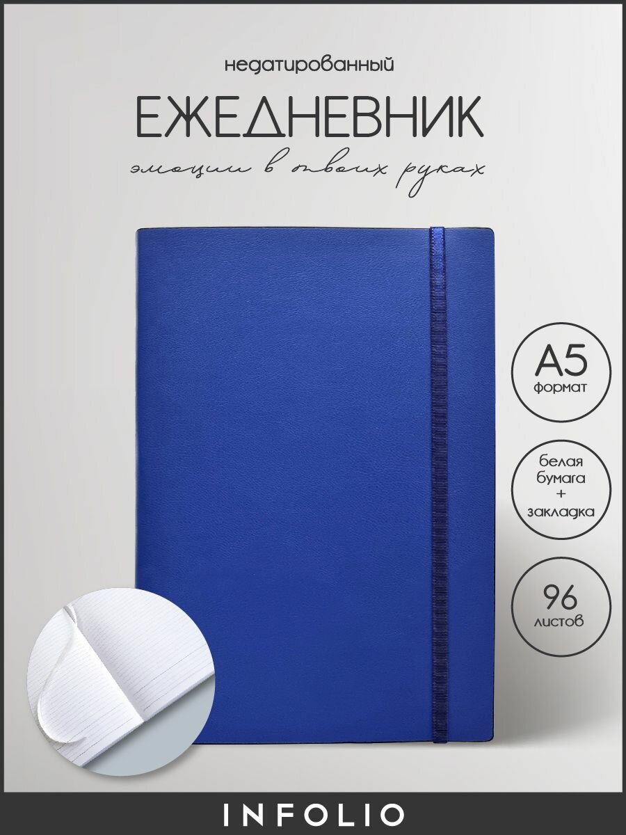 Удобный облегченный недатированный ежедневник А5 формата (140х200 мм) станет не только незаменимым помощником в ведении дел, но добавит яркости в повседневную рутину.Мягкая обложка из матовой гладкой искусственной кожи имеет плотную резинку, которая не позволит растрепаться листам, и скругленные уголки, которые не порвут подкладку сумки.Недатированный внутренний блок в линейку на 96 листов (192 страницы) с информационным блоком - из высококачественной белой бумаги плотностью 70 г/м2 с прямыми уголками.В ежедневнике также имеется одна удобная атласная закладка, которая поможет быстро найти нужный разворот.