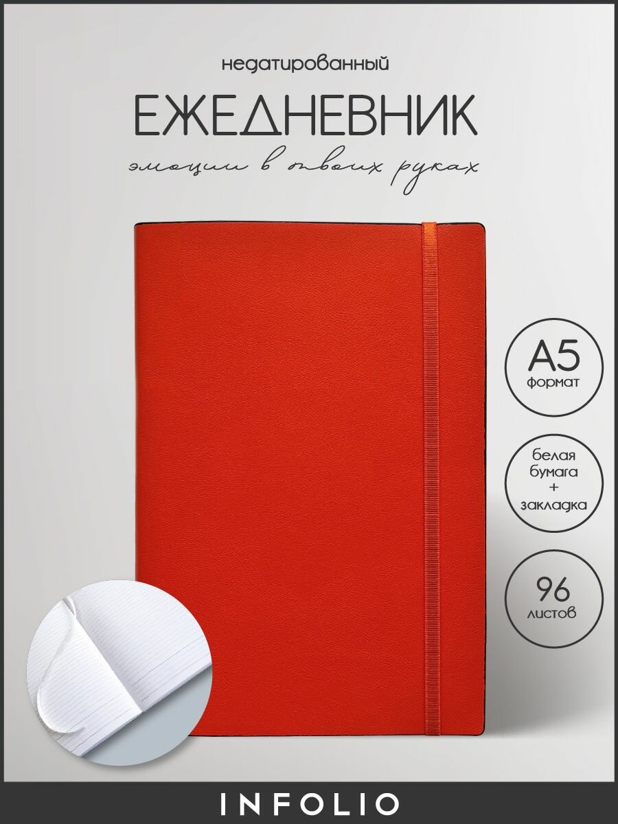 Удобный облегченный недатированный ежедневник А5 формата (140х200 мм) станет не только незаменимым помощником в ведении дел, но добавит яркости в повседневную рутину.Мягкая обложка из матовой гладкой искусственной кожи имеет плотную резинку, которая не позволит растрепаться листам, и скругленные уголки, которые не порвут подкладку сумки.Недатированный внутренний блок в линейку на 96 листов (192 страницы) с информационным блоком - из высококачественной белой бумаги плотностью 70 г/м2 с прямыми уголками.В ежедневнике также имеется одна удобная атласная закладка, которая поможет быстро найти нужный разворот.