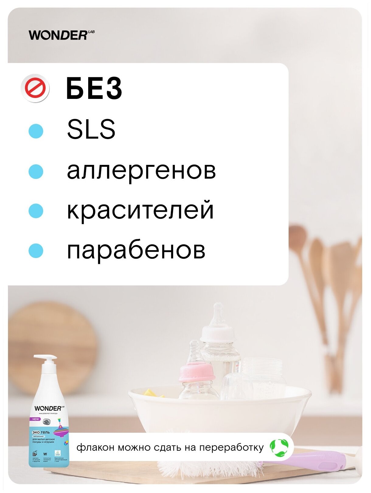 Средство для мытья детской посуды WONDER LAB 550 мл. Эко гель разработан специально для мытья детской посуды, сосок и игрушек. Средство для детской посуды Вондер Лаб эффективно устраняет жир и запахи даже в холодной воде. Безопасно для малышей, имеет нейтральный PH и полностью смывается водой в считанные секунды, позволяя уменьшить расход воды и быть уверенными в том, что остатки средства не попадут в детский организм. Теперь можно не волноваться, если ребенок решит сам помыть за собой посуду.Бальзам для мытья посуды не сушит и не раздражает кожу, не содержит резких отдушек и красителей. Жидкое мыло для посуды Вандер Лаб полностью безопасно для детской посуды и бутылочек для самых маленьких. Благодаря нежной консистенции гель эко WONDERLAB легко и быстро смывается с поверхности, хорошо промывая посуду и игрушки даже сложной формы с изгибами и резьбой. Эко жидкость подходит для мытья овощей и фруктов, поильников, игрушек, в том числе пластиковых, деревянных, резиновых и металлических. Детский гель для посуды WONDER LAB не содержит парабенов и спиртов.В составе жидкости для мытья посуды используются только безопасные натуральные ПАВ с пониженным содержанием на основе кокосового масла, агрессивные синтетические ПАВ исключены. Не поддерживаем тестирование на животных. Мы называем наши продукты экологичными, потому что основа Biomicrogel, который разлагается на 98 процентов за 24 часа. Средства мы делаем из овощей и фруктов. Средство без фосфатов и фосфонатов. Безопасно для септиков.