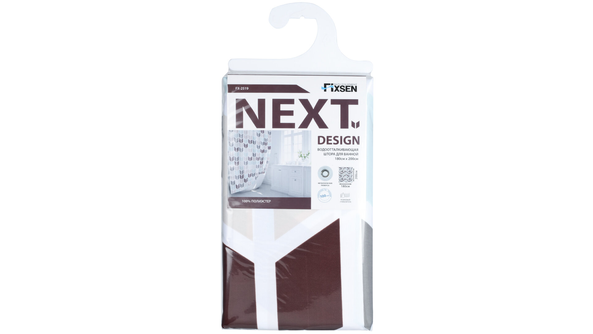 **Штора для ванны Fixsen Next FX-2519** предотвращает разбрызгивание воды на пол ванной комнаты, мебель. Изготовлена из полиэстера. Имеет водоотталкивающую обработку. На поверхность нанесен геометрический разноцветный принт. Не регулируется по ширине. Крепится к штанге на кольца (не входят в комплект поставки). Для них предусмотрено 12 отверстий с металлическими ушками. Для ухода применяется ручная стирка.