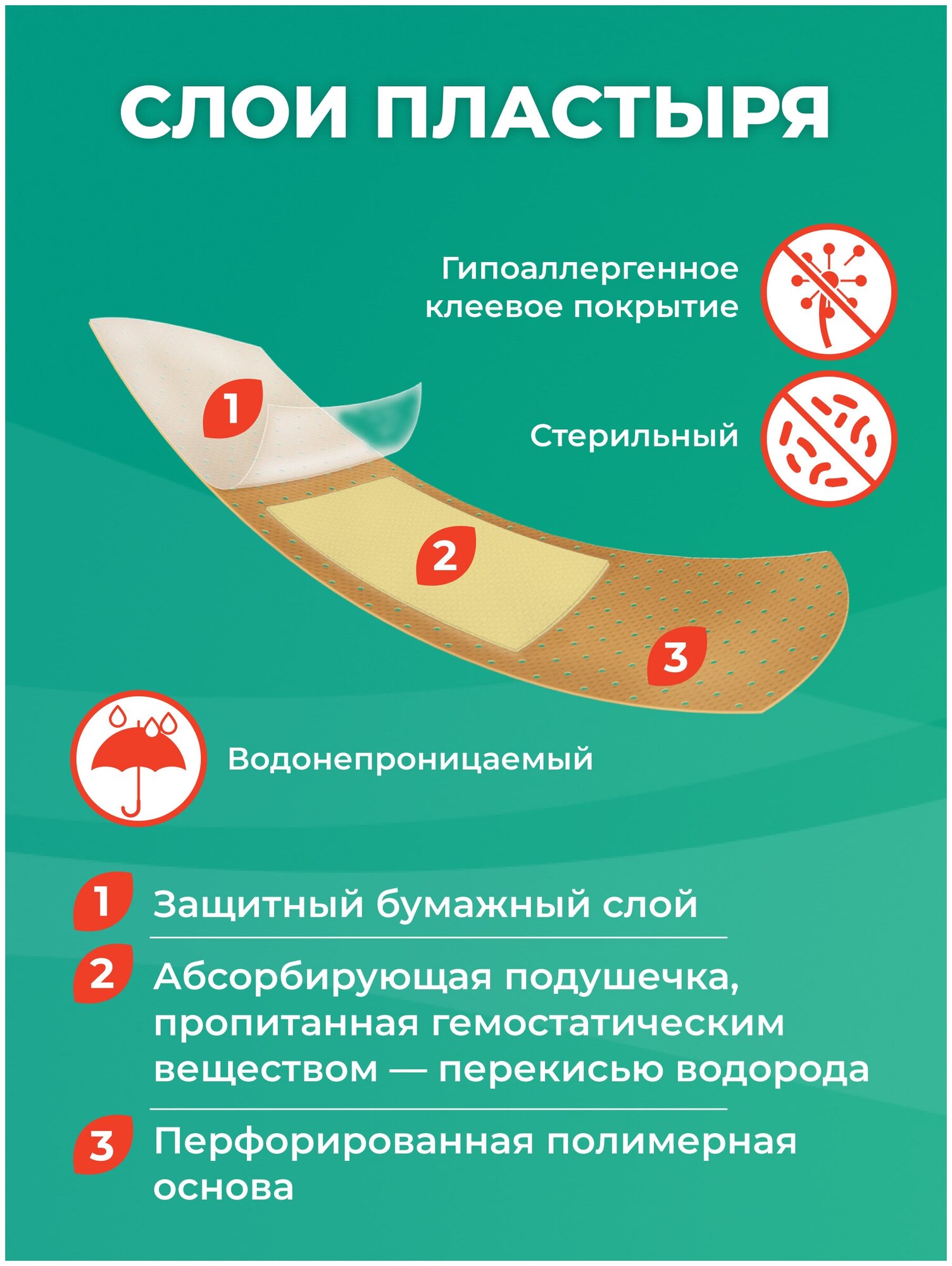 Набор из 15 лейкопластырей на полимерной основе. Предназначены для остановки кровотечения в течение 1-2 минут. Снимаются без боли и не оставляют следов.