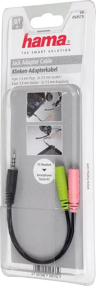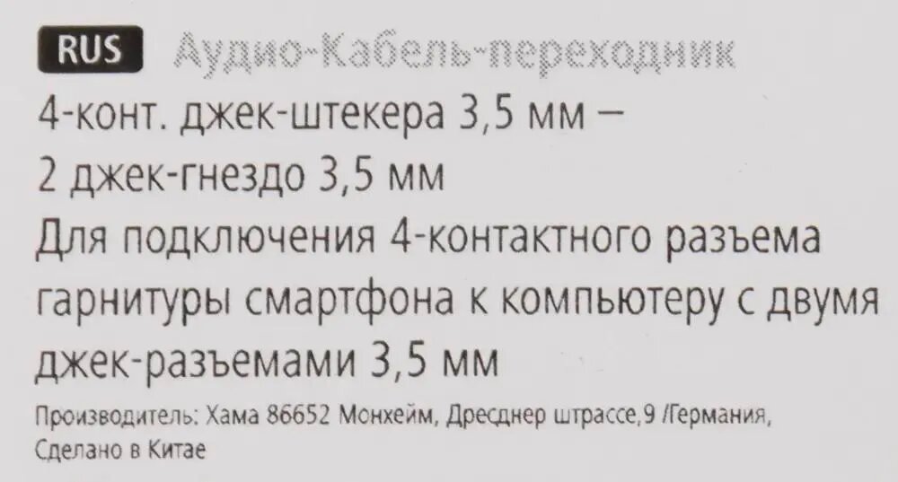| Назначение | Кабель-переходник для подключения наушников с миниджеком 3.5 мм и микрофона с миниджеком 3.5 мм или гарнитуры с 2 миниджеками 3.5 мм к 4-полюсному разъему для гарнитуры смартфона, планшета или ноутбука |