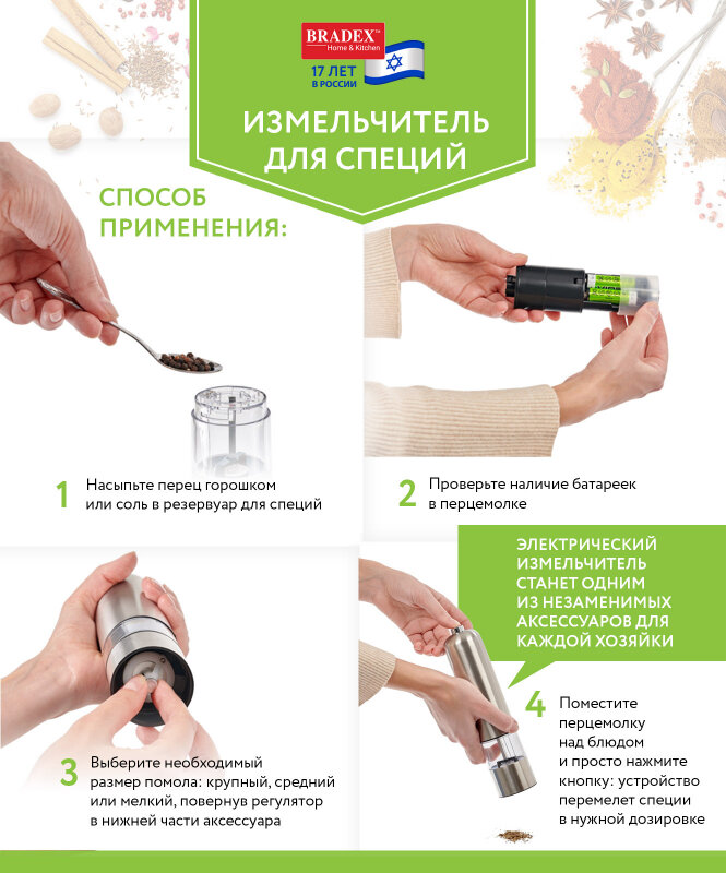 Мельница Bradex , работающая от батареек, легко перемелет соль, перец и другие твердые специи — для этого вам нужно будет лишь нажать кнопку. Встроенный в корпус из высококачественной нержавеющей стали светодиодный фонарик позволяет молоть специи даже в темноте.