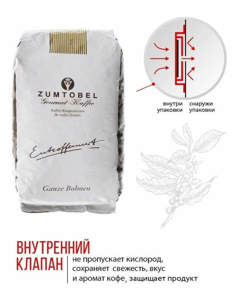 Кофе без кофеина в зернах Julius Meinl Zumtobel- декофеинизирован методом вапоризации, благодаря чему зерно сохраняет весь вкус и аромат, характерные для арабики этого сорта. Идеален для людей, которые высоко ценят вкус кофе. Эту кофейную смесь можно употреблять в любое время суток, в том числе на ночь. Она также прекрасно подходит для приготовления в кофемашине или турке.