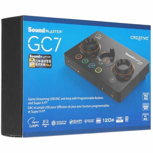 | Упаковка | комплект поставки 1 Sound Blaster GC7, 1 кабель-переходник с USB-C на USB-A, 1 оптический кабель, 1 кабель 3,5-мм для AUX-входа. |