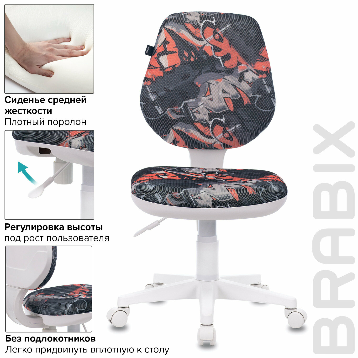 | Дополнительно | Детское кресло BRABIX "Fancy MG-201W" с сочетанием пластиковой основы белого цвета и ярким рисунком. Конструкция кресла продумана до мелочей и максимально безопасна для ребенка., , Пружинно-винтовой механизм качания спинки обеспечивает опору и поддержку, а также позволяет регулировать угол наклона. При помощи специального рычага можно отрегулировать высоту сидения., , Крестовина кресла максимально увеличивает площадь основания и почти исключает возможность опрокидывания., , Газлифт выдерживает и ребенка, и взрослого весом до 120 кг., , Пятилучие - пластиковое белого цвета., , Спинка и сиденье имеют плотную набивку, средней жесткости., , Компактная модель, которая легко выдерживает нагрузку взрослого человека. |