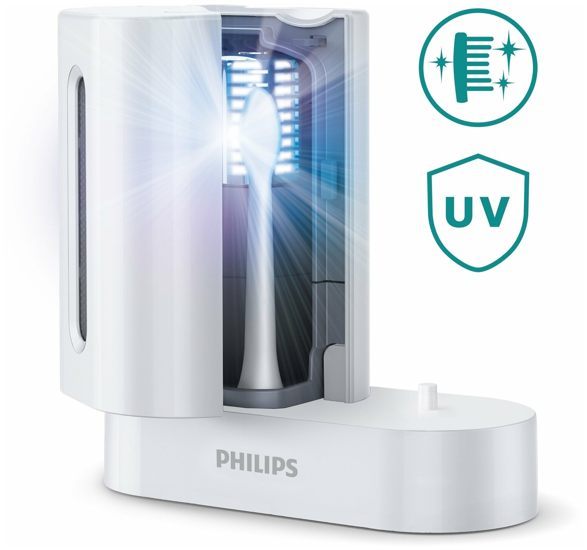 УФ-стерилизатор помогает убивать бактерии и вирусы на сменных чистящих насадках. Чистящие насадки окружаются дезинфицирующим светом. УФ-дезинфектора распределяет дезинфицирующий свет вокруг всей поверхности чистящих насадок для оптимального результата.