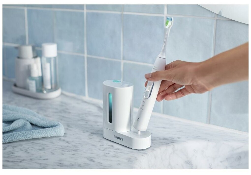 | Описание | Помогает убивать бактерии и микробы на чистящих насадках. Не волнуйтесь о распространении бактерий и вирусов — очистка чистящих насадок Sonicare производится уникальной технологией УФ-дезинфекции, уничтожающей до 99 % бактерий и вирусов без использования химикатов. |