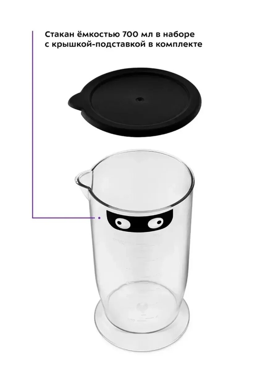 Смешивать ингредиенты удобно в пластиковом стакане ёмкостью 700 мл, который идёт в комплекте. К стакану прилагается крышка, которую можно использовать как подставку под стакан во время смешивания или для хранения любимого смузи прямо в стакане.