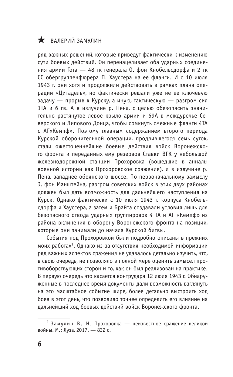 Как и многие другие события Великой Отечественной войны, бои на Курской дуге были фактически засекречены советской стороной на десятилетия. Полвека доступ к документам войск, участвовавших в этом переломном сражении, имел лишь ограниченный круг военных специалистов. Только недавно эти фонды были, наконец, открыты. Валерий Замулин одним из первых приступил к их анализу и систематизации. Рассекреченные документы Центрального архива Министерства обороны России и трофейного отдела Национального архива США позволяют автору детально описать кульминационный момент Курской битвы — тяжелые бои на Обояньском направлении и знаменитый контрудар Воронежского фронта под Прохоровкой 12 июля 1943 года, — восстановив ход событий буквально по часам и минутам, проанализировав действия сторон и главные причины успехов и неудач. Ожесточенные танковые бои на южном фасе Огненной дуги предстают перед читателем в новом свете — так, как видели их непосредственные участники событий: солдаты, офицеры...