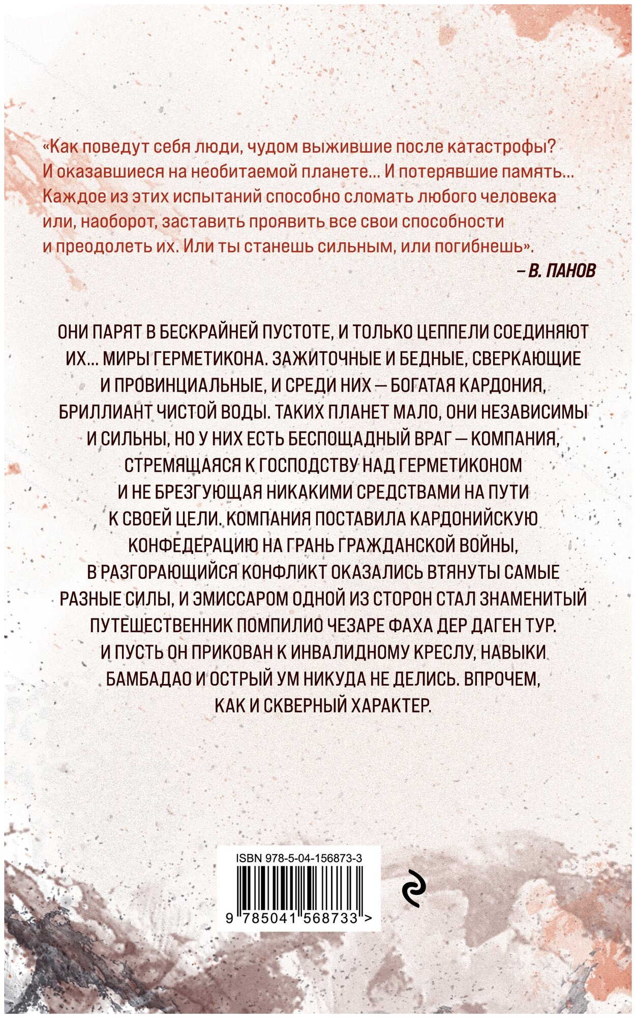 Они парят в бескрайней Пустоте, и только цеппели соединяют их... Миры Герметикона. Зажиточные и бедные, сверкающие и провинциальные, и среди них - богатая Кардония, бриллиант чистой воды. Таких планет мало, они независимы и сильны, но у них есть беспощадный враг - Компания, стремящаяся к господству над Герметиконом и не брезгующая никакими средствами на пути к своей цели. Компания поставила Кардонийскую конфедерацию на грань гражданской войны, в разгорающийся конфликт оказались втянуты самые разные силы и эмиссаром одной из сторон стал знаменитый путешественник Помпилио Чезаре Фаха дер Даген Тур. И пусть он прикован к инвалидному креслу, навыки бамбадао и острый ум никуда не делись. Впрочем, как и скверный характер.