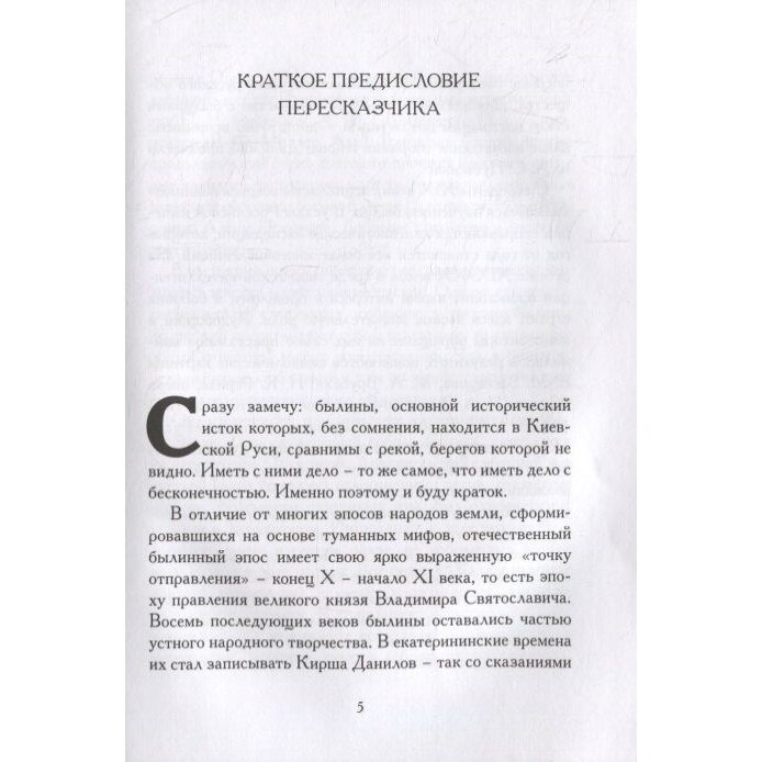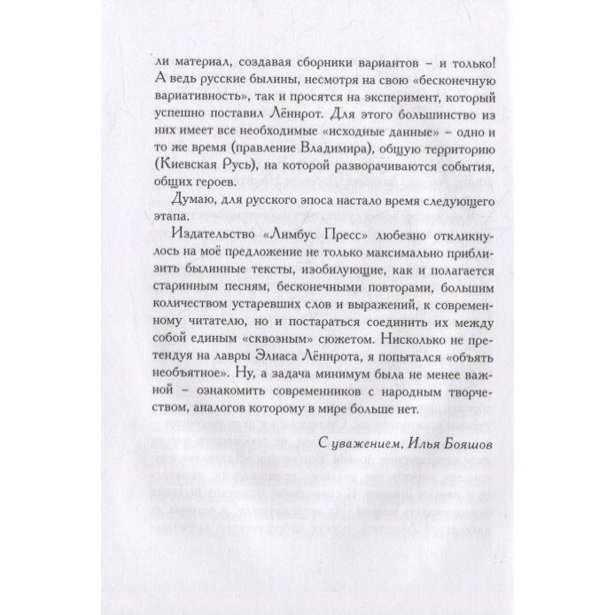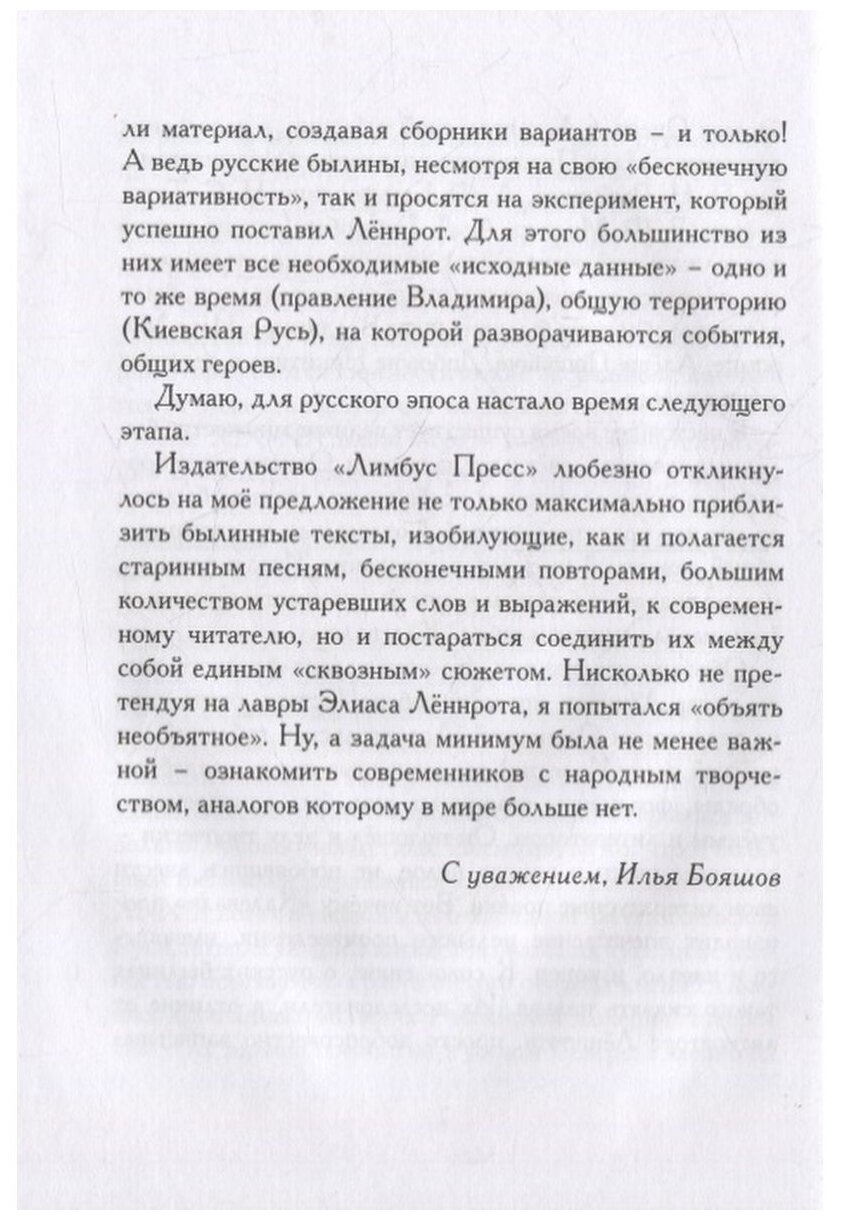 Свод русских былин богатырского цикла довольно велик и насчитывает множество вариативных сюжетов, записанных в разное время в разных местах со слов многих десятков "народных рапсодов". В своём прозаическом пересказе этого былинного наследия писатель Илья Бояшов не только наглядно представляет всё его мифопоэтическое богатство, но и выстраивает повествование в той очерёдности, которая позволяет за совокупностью разрозненных историй увидеть контуры единого полотна русского народного эпоса.