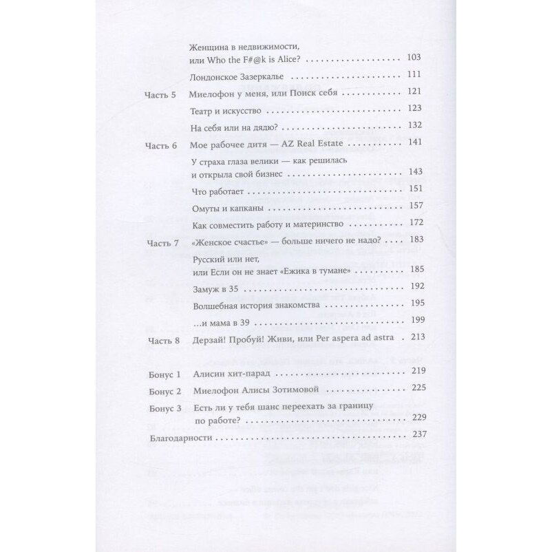 Сейчас агентство AZ Real Estate закрывает сделки на сотни миллион фунтов, имя Алисы Зотимовой на слуху у многих, кто интересуется жилой и коммерческой недвижимостью в Лондоне, а эта книга расскажет об этапах ее жизненного пути, карьере и личной жизни: