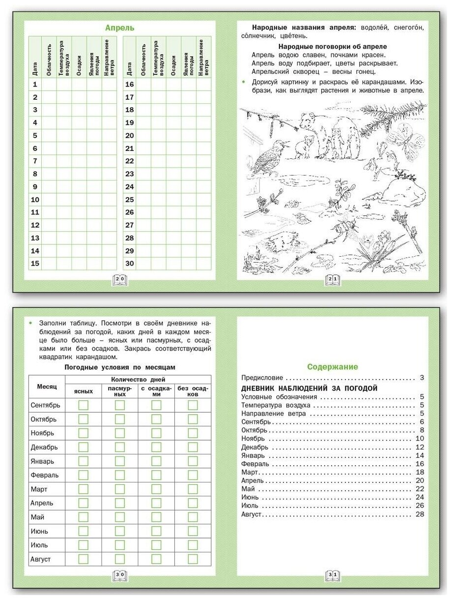 Рабочая тетрадь разработана в соответствии с требованиями ФГОС НОО. Пособие предназначено для регулярной практико-ориентированной деятельности учеников. Наблюдение за погодой, живой и неживой природой учит детей анализировать, сравнивать, устанавливать причинно-следственные связи. Работа с пособием поможет в развитии творческих способностей, памяти, внимания, логики детей; сформирует умение работать с таблицами, описывать результаты наблюдений и т. д.