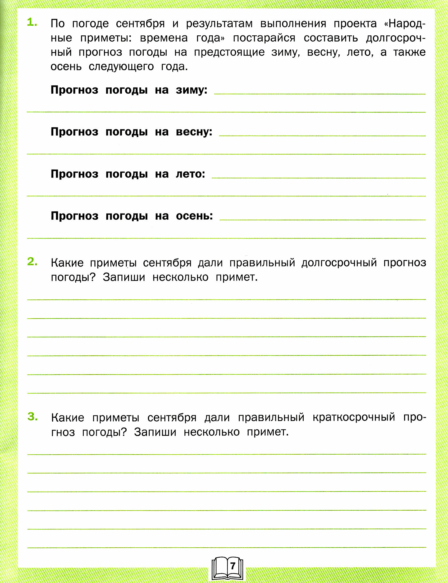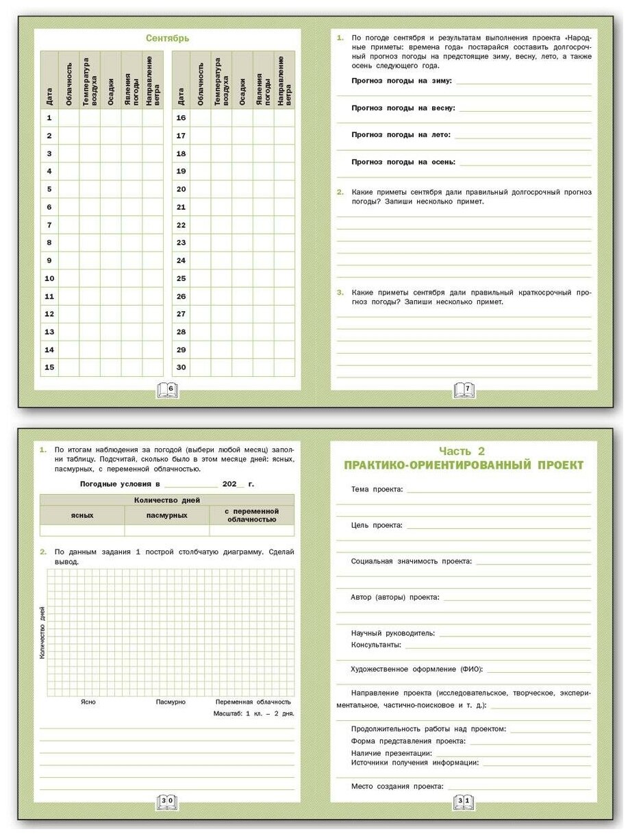 Наш учитель попросил заказать это пособие для всего класса, ребятам очень нравится. Интересный способ погрузиться в практическое исследование окружающего мира)) Во второй части предлагается сделать проект по народным приметам, связанным с погодой, очень увлекательно! Плотная белая бумага, четкие линии, удобная форма заполнения. 10/10!