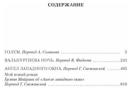 В настоящее издание вошли три самых известных романа мастера мистической прозы: «Голем», «Вальпургиева ночь» и «Ангел западного окна», самое значительное из всех произведений Майринка, задуманное им как итог всего творчества.