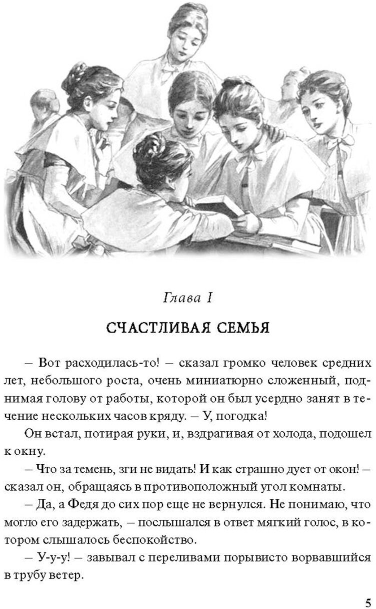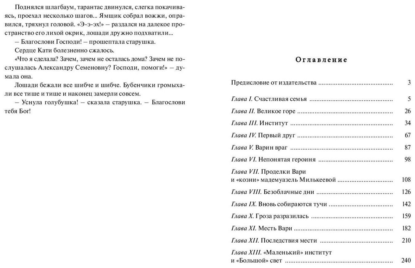 Книга рассказывает о другой прошедшей эпохе, о семье в которой трагически погиб глава семейства. О воспитании дочерей в женском институте. Очень интересно описывется быт сто лет назад. Книгу покупала для дочери 10 лет, ей книга понравилась. Средний формат книги. В книге 253 страницы. Черно-белые иллюстрации, их не очень много. Бумага белая, слегеп просвечивает. Шрифт не крупный, но читается нормально.