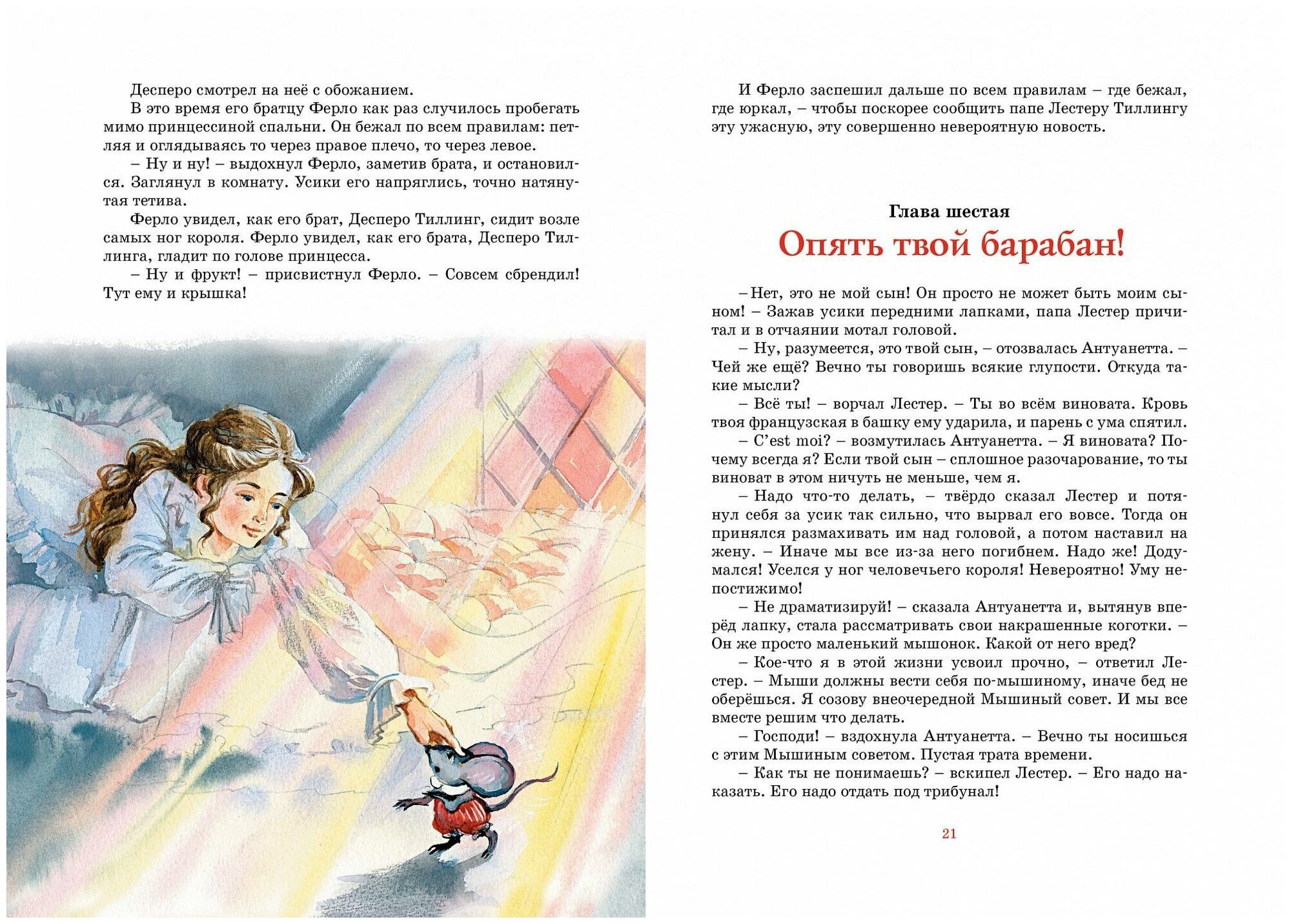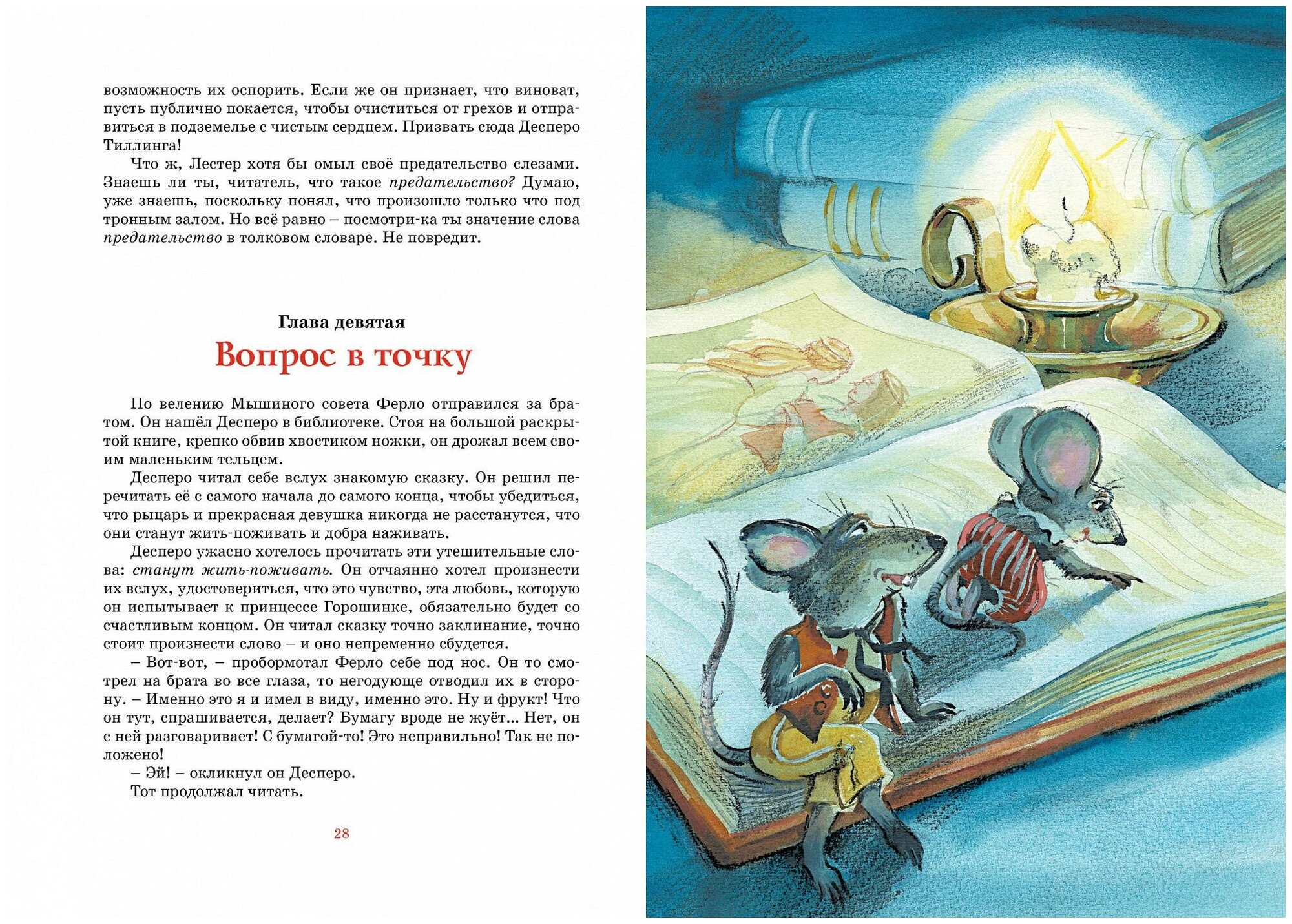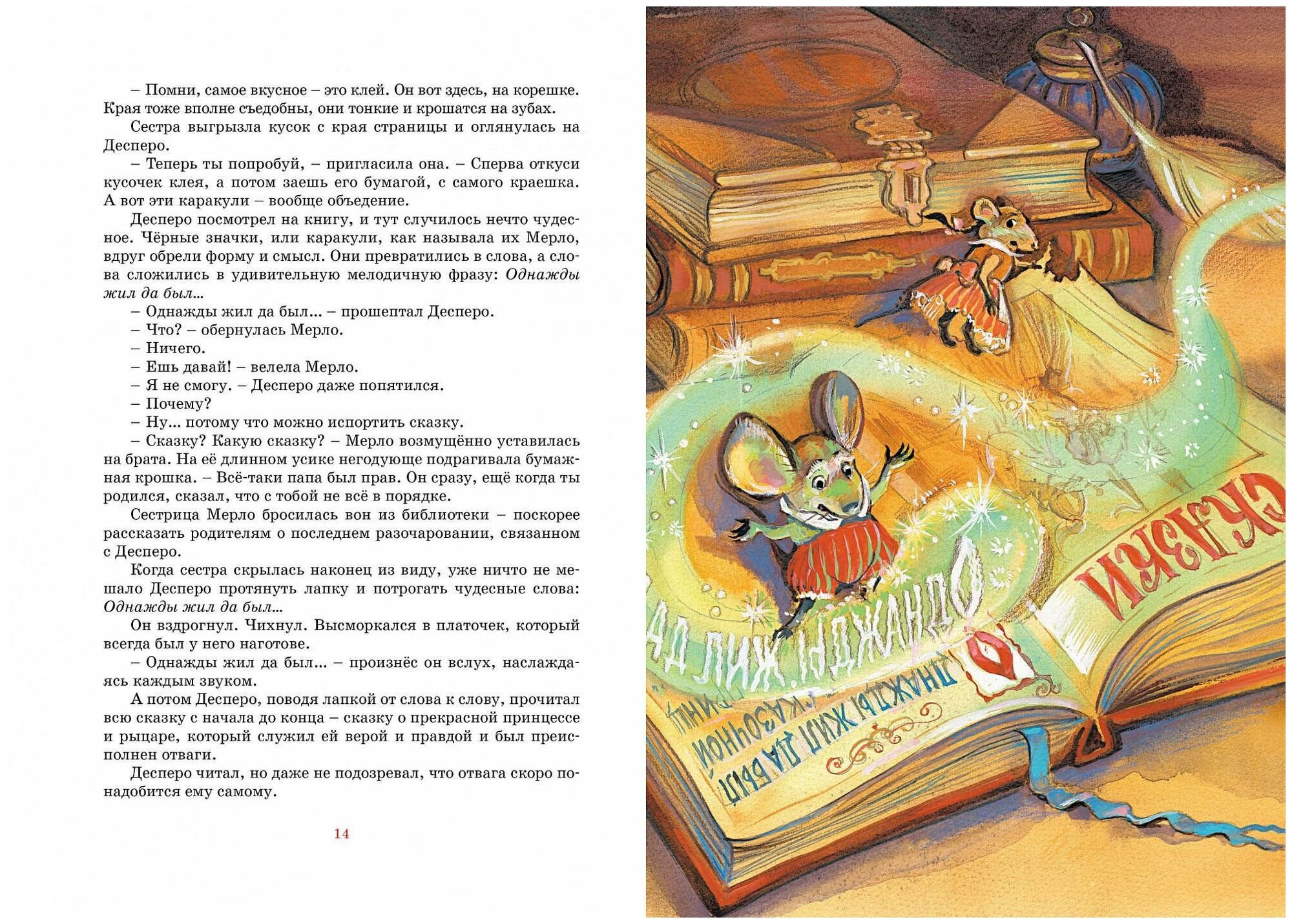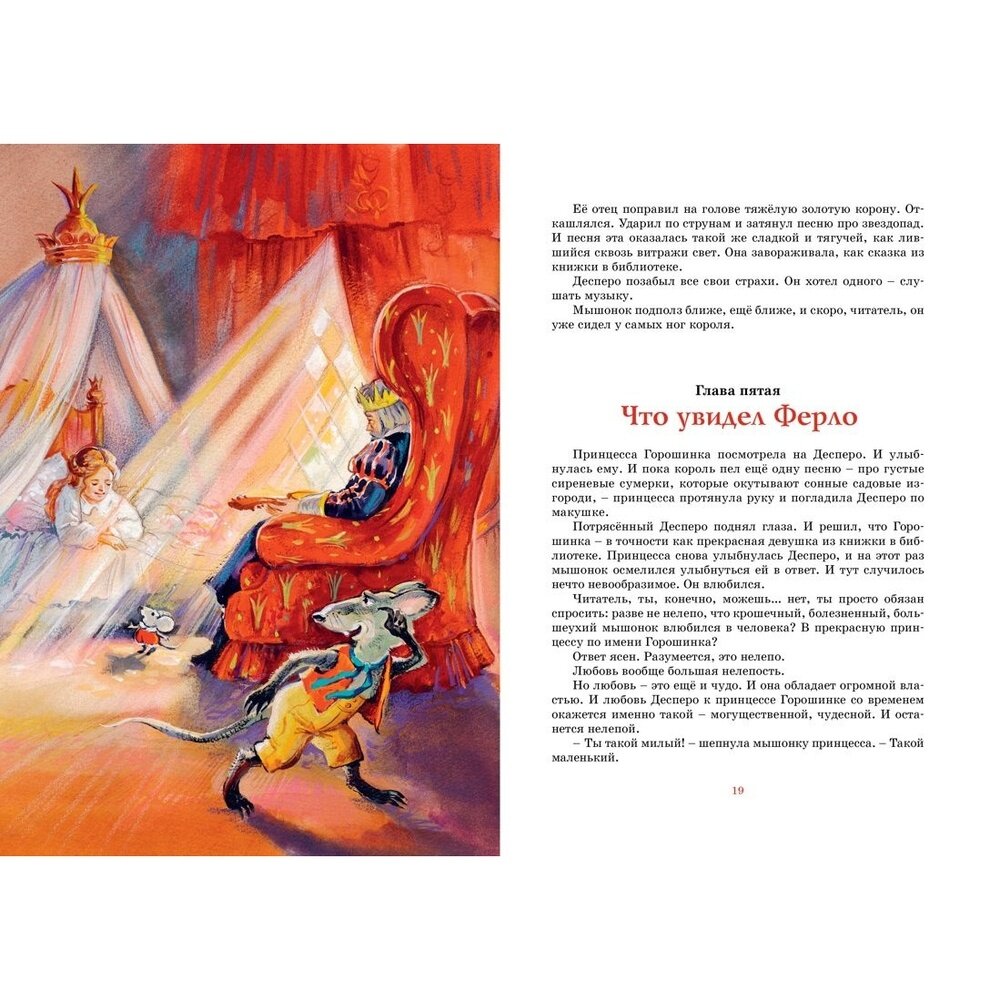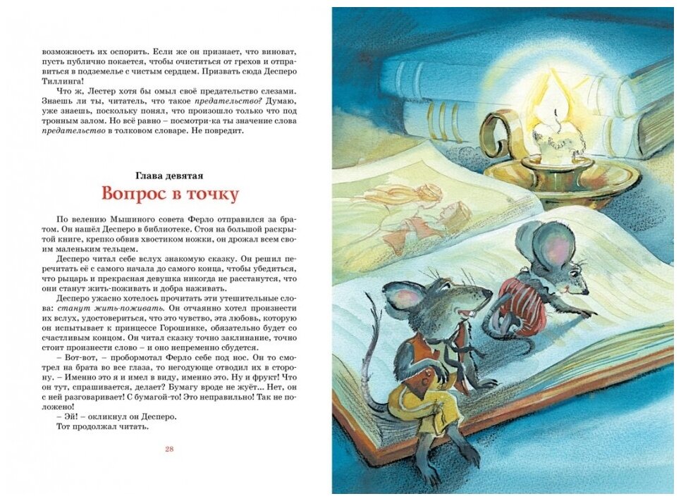 Только что я прочитала эту книгу. Прочитала сама. Впечатлена, и сильно. Совершенно необычный, неизбитый сюжет, необычные герои. Мышонок Десперо, единственный из мышей полюбивший читать книги, который захотел стать и стал рыцарем для своей любимой, для принцессы. Крысенок Роскуро, единственный из всех крыс возлюбивший свет. Принцесса Горошинка, даже заточенная обманом в подземелье без всякой надежды выбраться оттуда, не теряющая в сердце любви и сочувствия к своим палачам. Перевод хороший, ненавязчивый, четкий, грамотный. Бумага плотная. Шрифт удобный для чтения. Картинки - нормальные. Продвигаясь по первой трети книги, я была уверена, что не стану читать ее 9-летке. Мрачно, страшно, рано... Дочитав, тут же заказала ее, чтобы немедленно ему ее прочесть и вообще иметь дома. 7-летней девочке не уверена, что книга подойдет. 9-летнему мальчику - самое то. Она воспитывает сердце, дает мужество и иллюстрирует евангельские истины, ни разу не обращаясь к религиозной теме. В общем, "доколе Свет с вами, веруйте в свет". Книгу рекомендую.