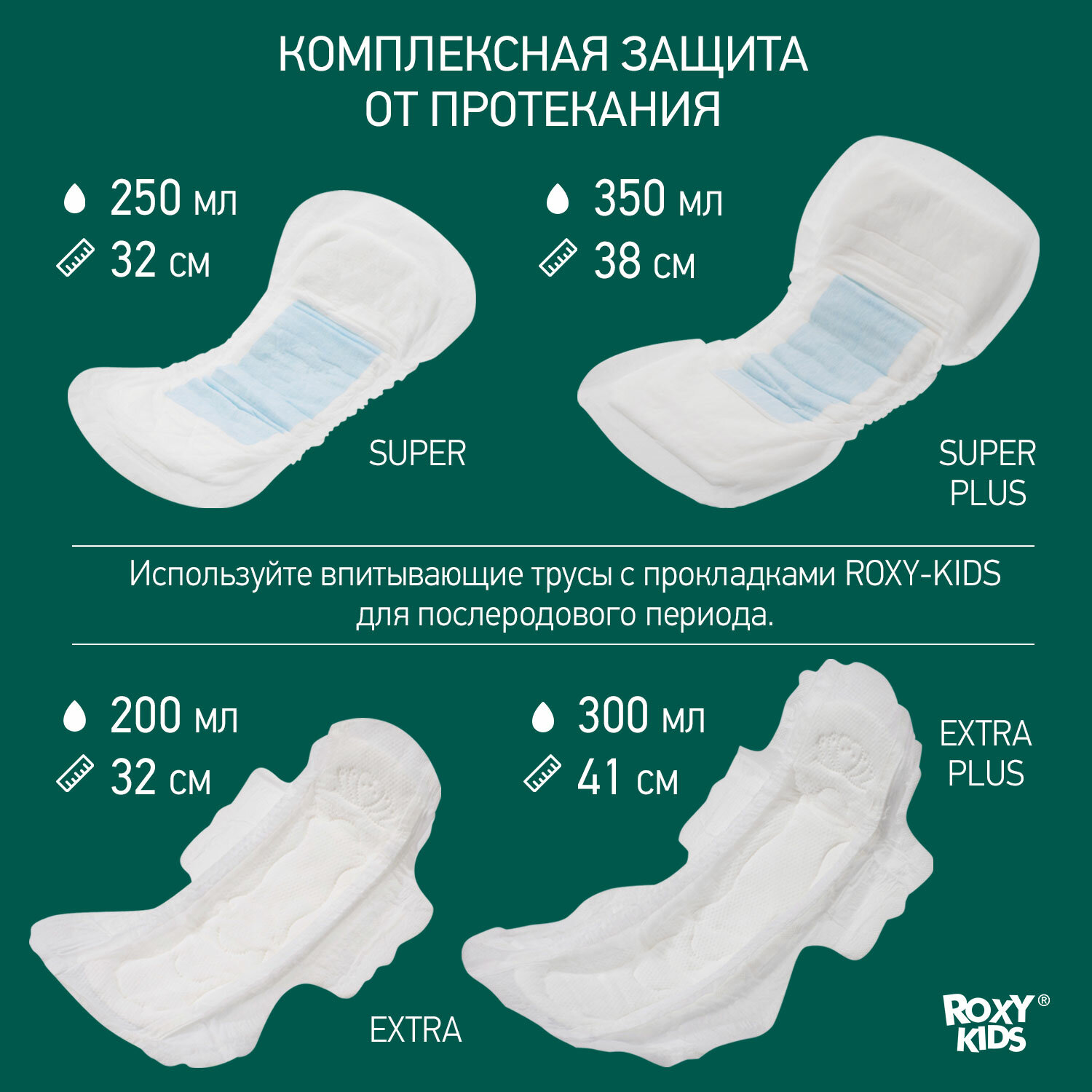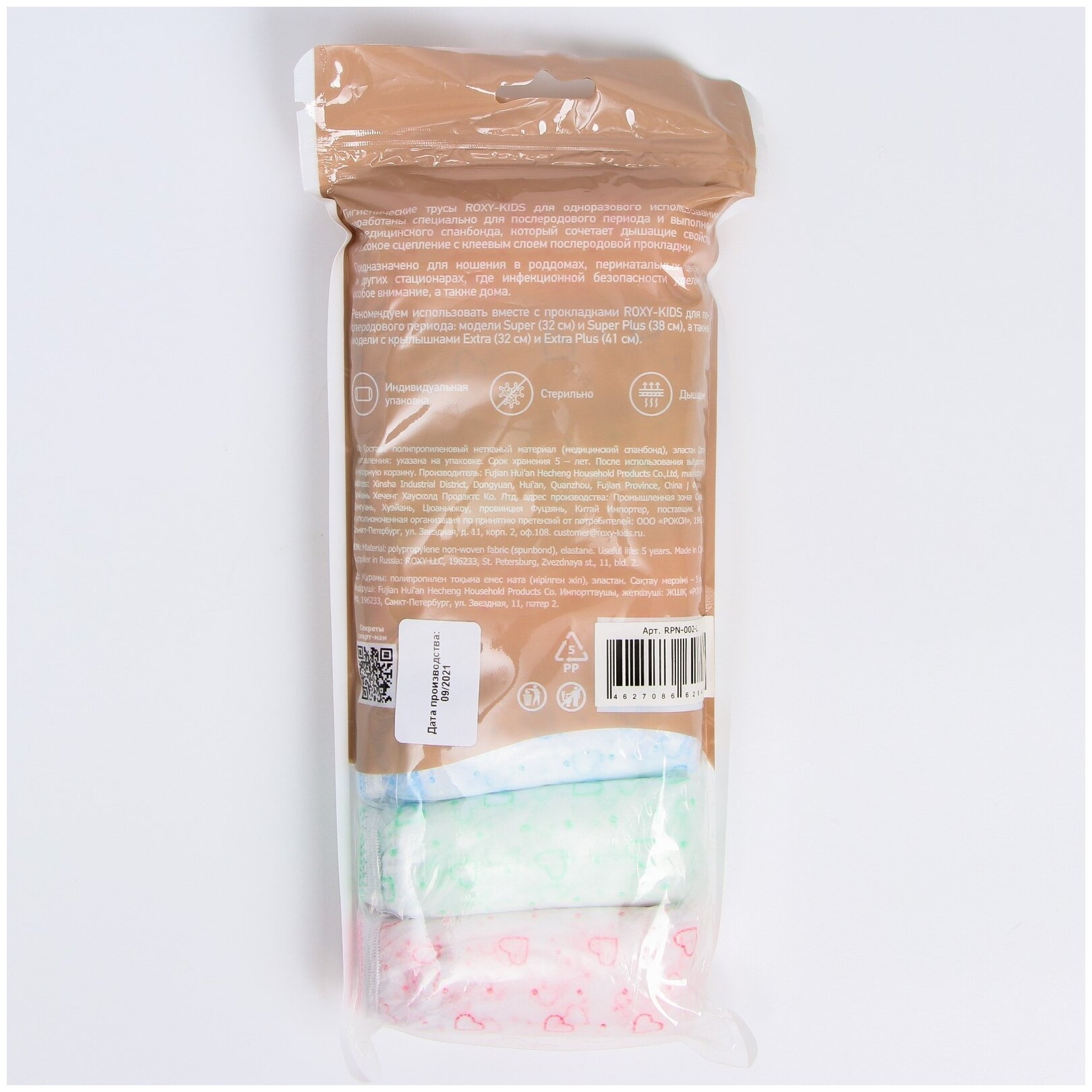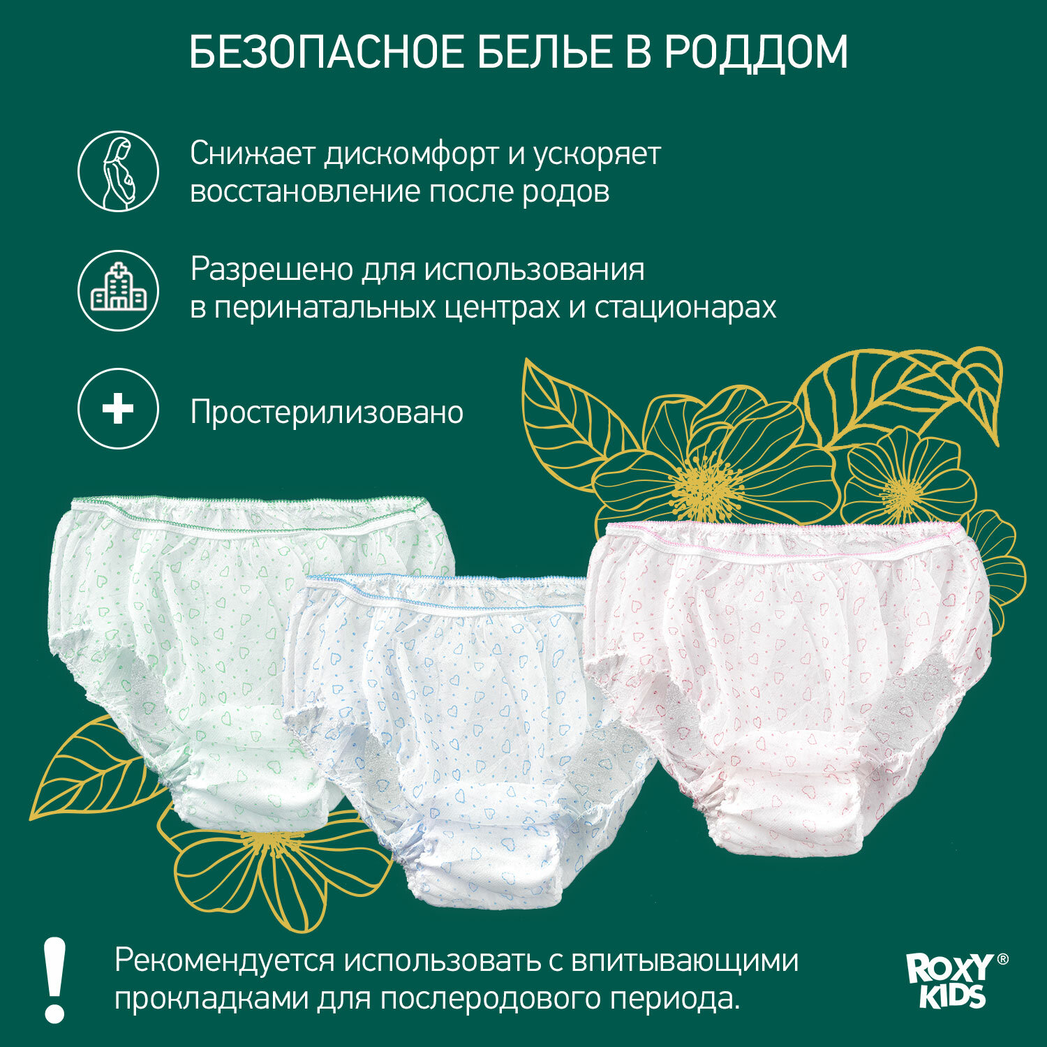 Гигиенические трусы ROXY-KIDS для одноразового использования разработаны специально для послеродового периода и выполнены из медицинского спанбонда, который сочетает дышащие свойства и высокое сцепление с клеевым слоем послеродовой прокладки. Предназначено для ношения в роддомах, перинатальных центрах и других стационарах, где инфекционной безопасности уделяется особое внимание, а также дома. Рекомендуем использовать вместе с прокладками ROXY-KIDS для послеродового периода: модели Super (32 см) и Super Plus (38 см), а также модели с крылышками Extra (32 см) и Extra Plus (41 см).