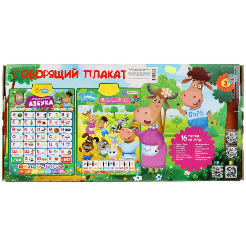 Двусторонний говорящий плакат 2 в 1 «Бурёнка Даша» ТМ «УМка» порадует вашего ребенка красочным дизайном и своим функционалом:соответствует ФГОС 2 рабочие стороны: музыкальная азбука + квест по мультфильму 300 стихов, песен, игр и фраз учим буквы, цвета, фигуры и стихи учим музыкальные инструменты, играем на пианино регулировка громкостиПолезная «база» для обучения ребёнка в виде говорящего плаката. Преподнесённую в визуальном и звуковом форматах информацию ребёнку будет проще усвоить и запомнить. Малыш с удовольствием будет нажимать на разнообразные кнопки и в лёгкой игровой форме знакомиться с буквами, цветами и формами, а также увлекательно проводить время за занимательными играми. Игровые занятия с говорящим плакатом ТМ «УМка» расширяют кругозор и способствуют развитию:памяти внимания визуального и слухового восприятия речи Размер: 42 х 59 х 2 см. Материал: пластмасса + металл. Работает от 3-х батареек типа ААА (не входят в комплект).Рекомендовано детям от 3-х лет.
