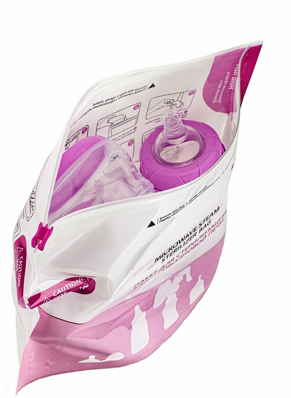 Пакет для стерилизации NDCG mother care используется для дезинфекции приспособлений для молокоотсосов, бутылочек, сосок, сосок-пустышек, менструальных чаш путем паровой обработки. Каждый пакет можно использовать до 20 раз. Для того чтобы вы могли определить, сколько раз был использован пакет, на нем напечатано возможное количество стерилизаций. Отмечайте каждую стерилизацию в специальном окне (маркер в комплекте). Пакет для стерилизации NDCG mother care предназначен для использования только с изделиями, подлежащими использованию в микроволновых печах. Преимущества: быстрая и надежная стерилизация, не содержит Бисфенол-А, стерилизует за 2 минуты, легко делать заметки, уничтожают 99.9% микробов и бактерий, 20 циклов на каждый пакет. Использование: вымойте изделия, налейте 60 мл воды, поместите изделия в пакет, поместите в микроволновую печь, вылейте горячую воду из пакета через отверстие для слива, используйте прихватки, берите пакет только за безопасную зону.