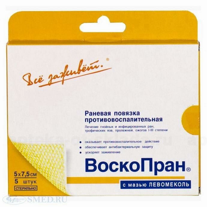 Противовоспалительная раневая повязка ВоскоПран, пропитанная мазью Левомеколь, представляет собой полиамидную сетку на текстильной основе, пропитанную воском, с нанесенной мазью Левомеколь.