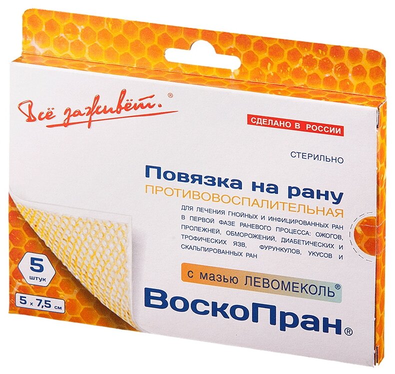 Стерильная сетчатая повязка, пропитанная пчелиным воском и мазью левометил. Сетчатая структура обеспечивает дренажный эффект для раневого экссудата, хорошо пропускает воздух. Воскопран обладает некоторым сорбирующим действием в отношении продуктов распада и способствует выводу их из пораженных тканей. Повязка хорошо моделируется на любых участках тела.