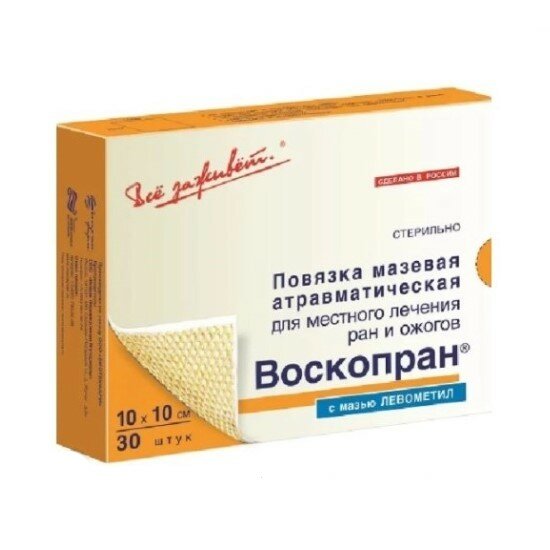 Стерильная сетчатая повязка, пропитанная пчелиным воском и мазью левометил. Сетчатая структура обеспечивает дренажный эффект для раневого экссудата, хорошо пропускает воздух. Воскопран обладает некоторым сорбирующим действием в отношении продуктов распада и способствует выводу их из пораженных тканей. Повязка хорошо моделируется на любых участках тела.