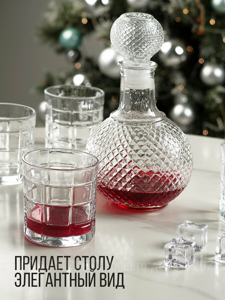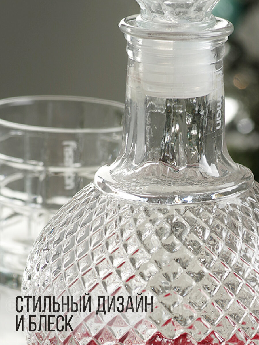 Графин выполнен из прочного высококачественного стекла. Он излучает приятный блеск и издает мелодичный звон. Графин сочетает в себе изысканный дизайн с максимальной функциональностью. Он украсит стол не только в праздник, но и станет незаменимым на вашей кухне.
