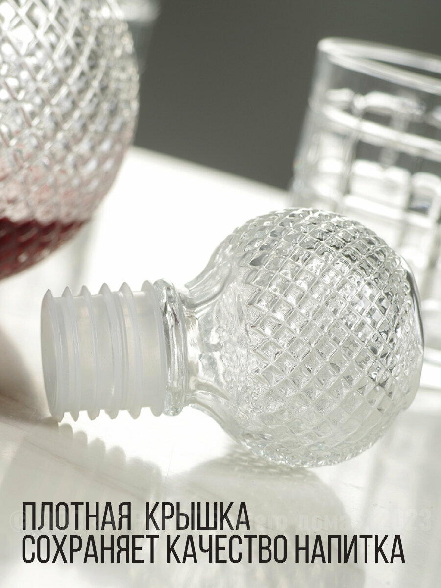 Стеклянный графин является безопасной и здоровой альтернативой пластиковым или металлическим сосудам. Стекло не поглощает ароматы и не передает вредные вещества в напиток, сохраняя его вкус и качество. Стекло изготовлено из прочного и стойкого материала, что гарантирует