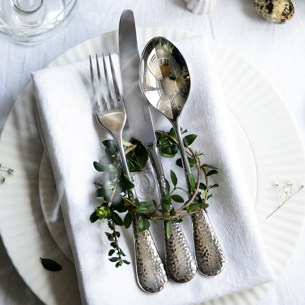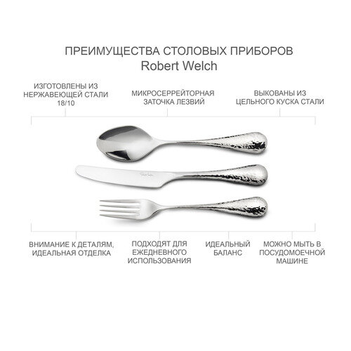 Страна изготовления Великобритания. Бренд ROBERT WELCH – это удивительное качество и доступная цена, представленные в одном месте. Набор столовых приборов ROBERT WELCH Honeybourne на 12 персон 84 предмета HONBR1099V/84 возможно приобрести поштучно по цене 78690 руб. руб. Все товары бренда ROBERT WELCH есть в наличии на складе. В случае проданного полного количества товаров, узнайте о поступлении у менеджеров нашего магазина. Еще до того, как Роберт Уэлш решил основать собственную компанию в 1955 году, он числился учеником у мастера по обработке серебра. Талантливого юношу привлекла одна технология шлифовки драгоценного металла, когда инструментом выступал лишь специальный молоток. Результатом кропотливого процесса становились гладкие, не текстурные столовые приборы. Коллекция Honeybourne возвращает нас в те времена и знакомит с классическими методами обработки.Разница лишь в том, что наряду с ручным трудом на заводах Robert Welch активно используется машинный. Ведь изготовление приборов из нержавеющей стали 18/10 — тяжелая работа. Ножи, вилки и ложки серии Honeybourne переливаются металлическим блеском и привлекают необычной текстурой. В тоже время, они идеально сбалансированы, удобно лежат в руке, а лезвие ножа заточено под оптимальным углом.В набор входит:HONBR1001L - 12 столовых ножей 24 см;HONBR1002L - 12 столовых вилок 21 см;HONBR1003L - 12 столовых ложек 20,5 см;HONBR1030L - 12 десертных ножей 20 см;HONBR1005L - 12 десертных вилок 18 см;HONBR1006L - 12 десертных ложек 18 см;HONBR1007L - 12 чайных ложек 13,5 см.