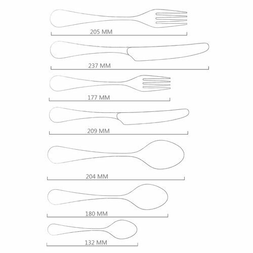 | Комплектация | Столовый нож (24 см) - 12 шт, вилка (21 см) - 12 шт, столовая ложка (20,5 см) - 12 шт, десертный нож (20 см) - 12 шт, десертная вилка (18 см) - 12 шт, десертная ложка (18 см) - 12 шт, чайная ложка (13,5 см) - 12 шт. |
