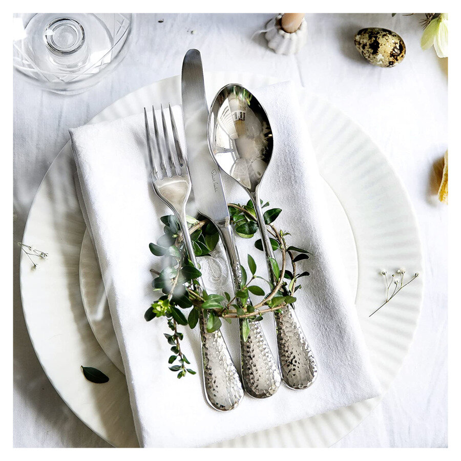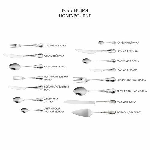 | Состав набора | 12 столовых ложек; 12 чайных ложек; 12 кофейных ложек; 12 столовых вилок; 12 десертных вилок; 12 столовых ножей; 12 десертных ножей |