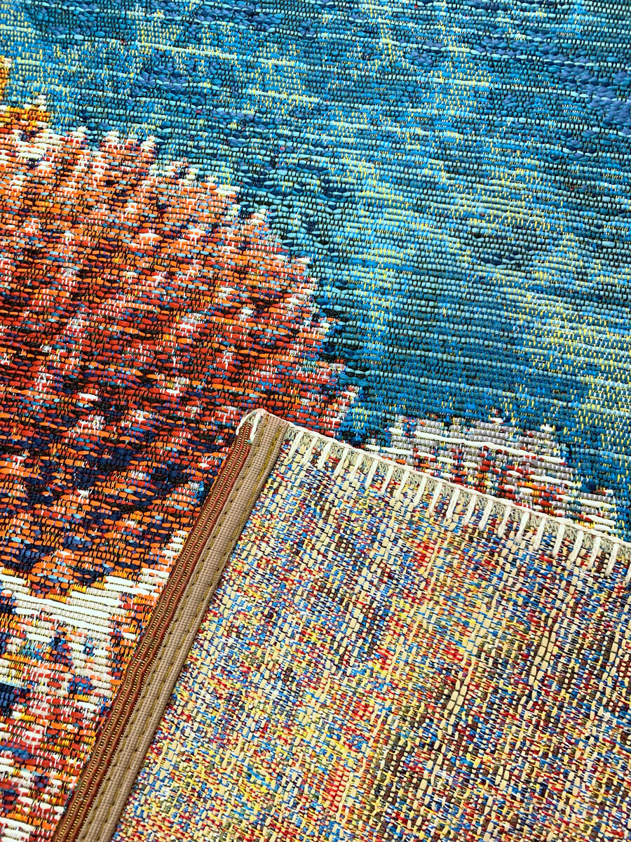 Безворсовый ковер из полипропилена и полиэстера, страна производства - Египет. Безопасность высоко ценится покупателями: ковры "Клеопатра Трейдинг Ко" сертифицированы по стандарту OEKO-TEX "Доверие текстилю". Тяжелый ковер (1050 г / кв. м.) плотно прилегает к полу, защищает напольное покрытие от повреждений и обладает звукоизолирующими свойствами. Ковры станут стильным украшением Вашего интерьера: яркие современные дизайны напоминают о летних солнечных днях и морском побережье. Ковер без ворса размером 110х170 см подойдет в комнату: гостиную, спальню, детскую, зал.