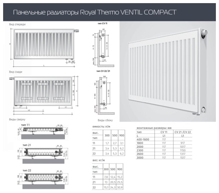 Модель: Ventil Compact VC21-500-1000/9016 Белый с нижним подключением
